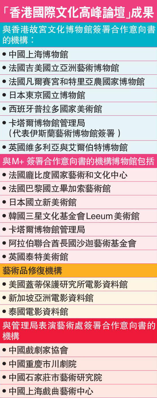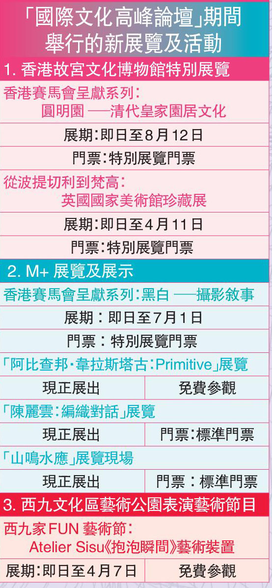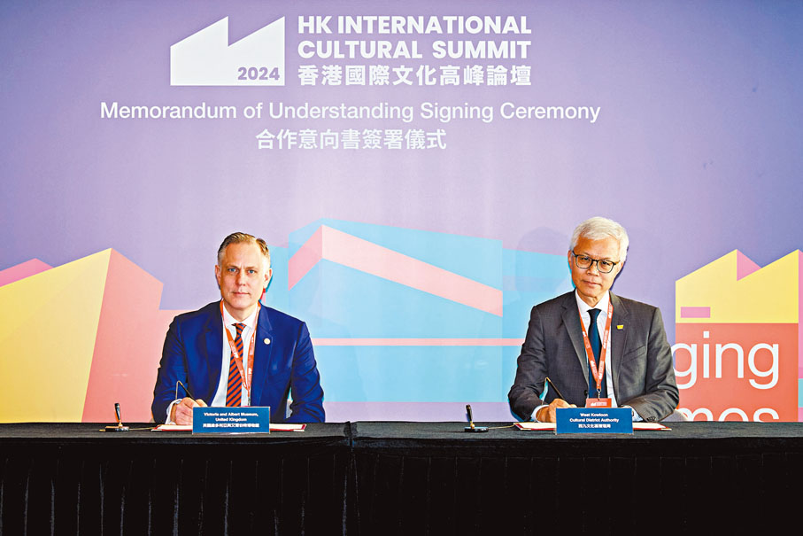 (香港文匯報記者 陳藝、焯羚)由西九文化區管理局主辦的首屆「香港國際文化高峰論壇2024」(文化高峰論壇)昨日假西九文化區戲曲中心拉開帷幕,今次論壇為本港歷來最大規模的國際文化峰會,一連3日的高峰論壇以「跨文化 越時代」為主題,雲集20位來自12個國家或地區的藝術館館長、博物館館長、藝文機構代表、知名的策展人擔任嘉賓講者,從文化區對城市社會及經濟轉型的貢獻,到數碼科技對博物館的影響和挑戰,及疫後文化交流等廣泛議題分享見解。在「國際文化高峰論壇」期間,西九文化區與全球21間頂尖博物館藝術品修復及研究機構、藝術中心、電影資料館、劇院及戲劇協會簽訂合作意向書。有「從波提切利到梵高:英國國家美術館珍藏展 」供大眾欣賞。業界領袖對與香港故宮文化博物館和M+博物館未來合作充滿期待,彰顯出中外文化交流中心的重要角色和地位。
