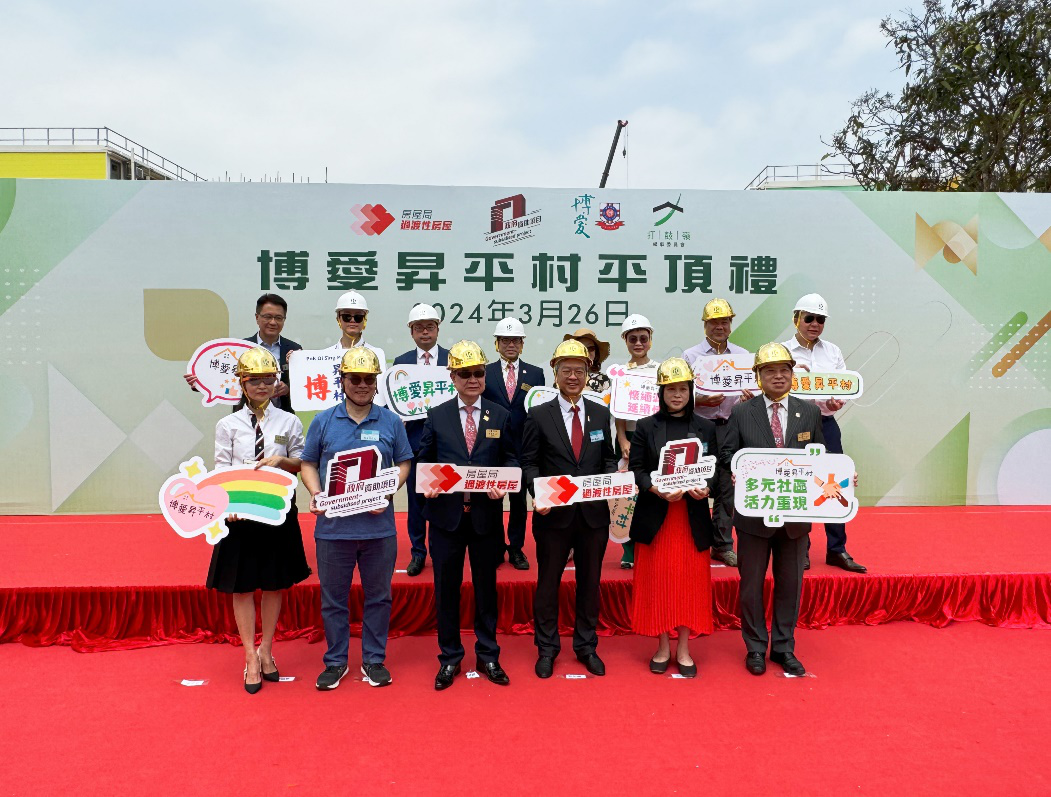 大公文匯全媒體報道,房屋局副局長戴尚誠,博愛醫院董事局主席陳首銘、候任主席周駿達,立法會議員、北區區議員、打鼓嶺區鄉事委員會主席陳月明等人今日(26日)上午一同出席在新界打鼓嶺坪輋路地段DD82 (昇平小學舊址)舉行的博愛昇平村過渡性房屋項目平頂禮。