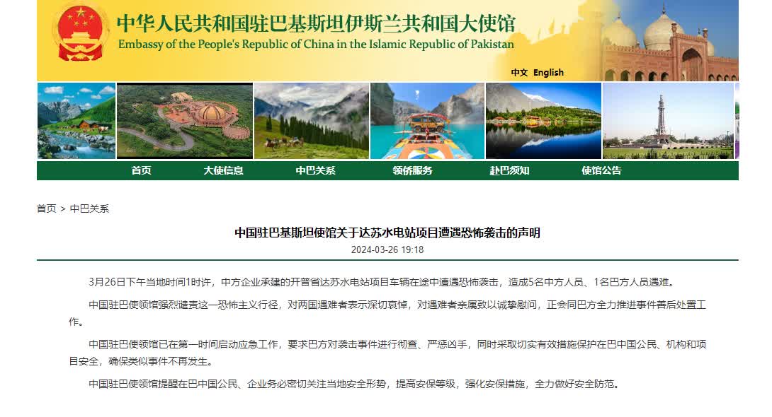 中國駐巴基斯坦大使館3月26日就達蘇水電站項目遭遇恐怖襲擊發表聲明。
