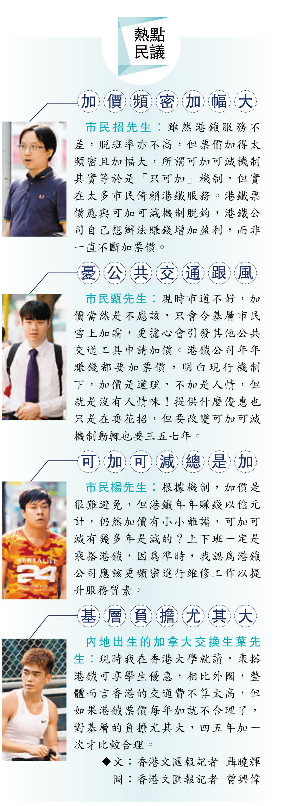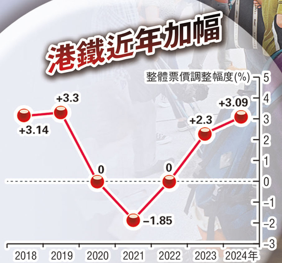 (香港文匯報記者 張弦 聶曉輝)按可加可減票價調整機制,港鐵票價今年本可加3.2%,惟觸發「封頂」機制,加幅調整至3.09%,餘下未加的0.11%及之前延後的1.85%會留待未來兩年處理,預計新票價今年6月生效。今次是機制引入生產力因素與物業發展利潤掛鈎後連續第二年加價。對此,多名香港特區立法會議員認為,雖然「封頂」機制發揮減低加幅的作用,但新加入的物業發展利潤掛鈎機制,未能完全反映港鐵業務狀況,令港鐵在坐擁逾70億元盈利的情況下仍能加價,建議票價方程式加入港鐵非物業發展收益元素,以全面反映港鐵盈利狀況。