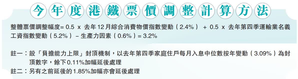 港鐵票價調整方程式最後一組數據——去年第四季運輸業名義工資指數昨日公布,按年升5.2%,連同去年12月通脹率2.4%,扣減港鐵生產力因素0.6個百分點,原本加幅3.2%。但方程式設有「封頂」機制,不得超過去年第四季家庭住戶入息中位數變動,即3.09%,因此今年港鐵票價只加3.09%,餘下的0.11%延後處理。