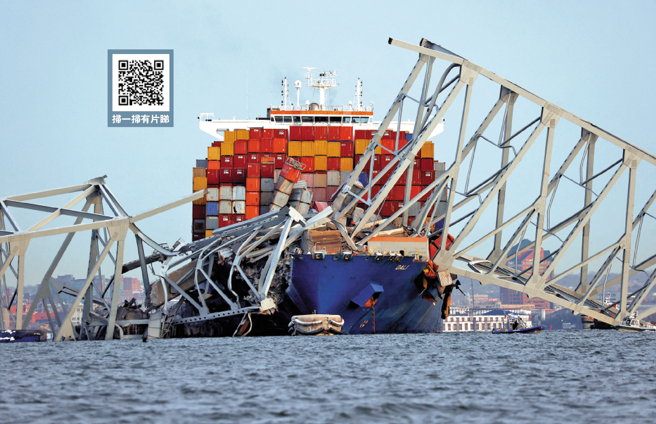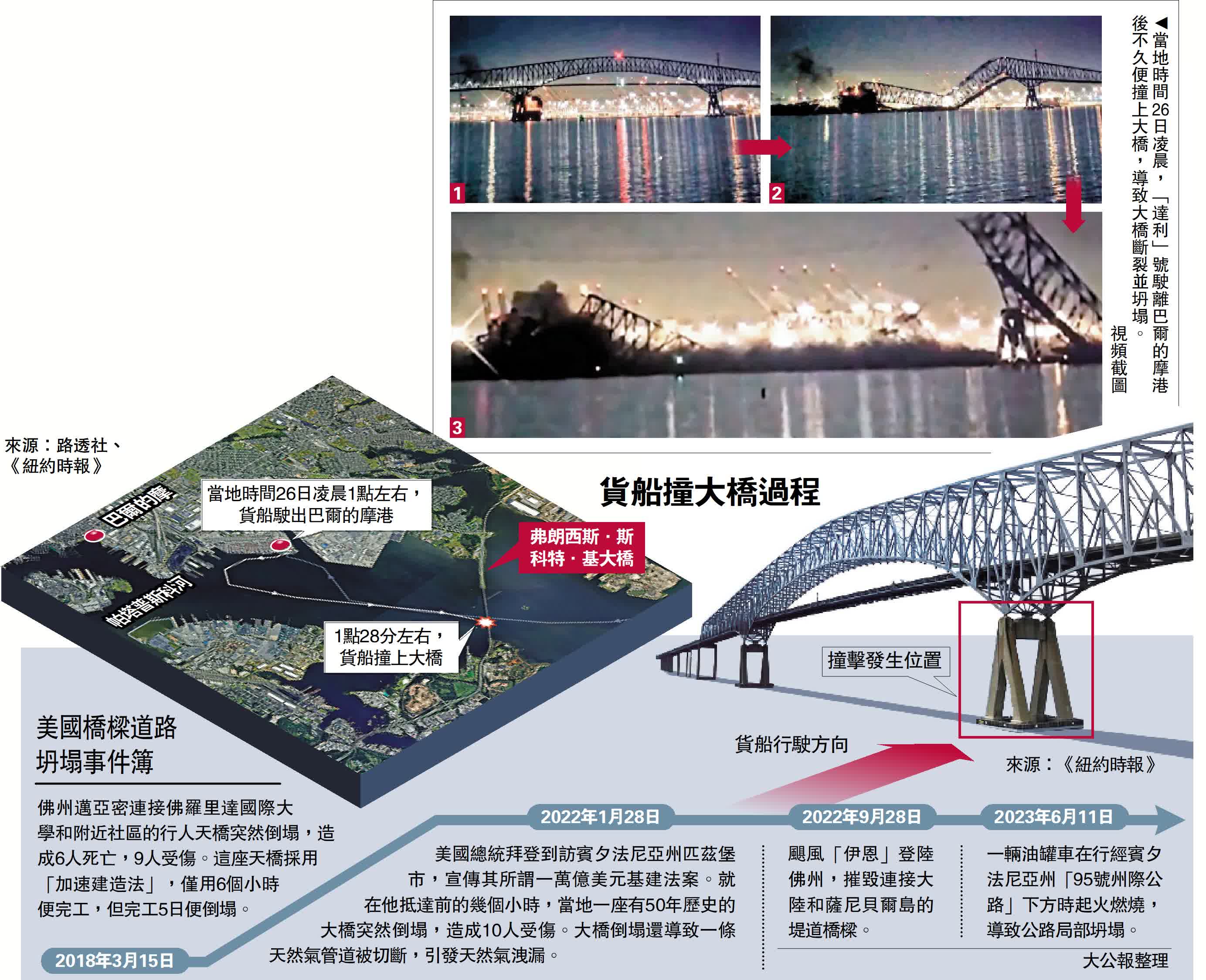 大公報綜合報道,美國馬里蘭州巴爾的摩市一座重要橋樑26日遭一艘貨船撞擊,橋面斷裂成數截,在20秒內坍塌。當地官員稱,當時正在橋上進行維修工作的8名工人,其中6人仍下落不明。馬里蘭州進入緊急狀態,救援工作正在緊張進行,進出巴爾的摩港的航運交通暫停。據報道,涉事貨船是懸掛新加坡國旗的「達利」號,在撞橋前失去動力並偏離航線。