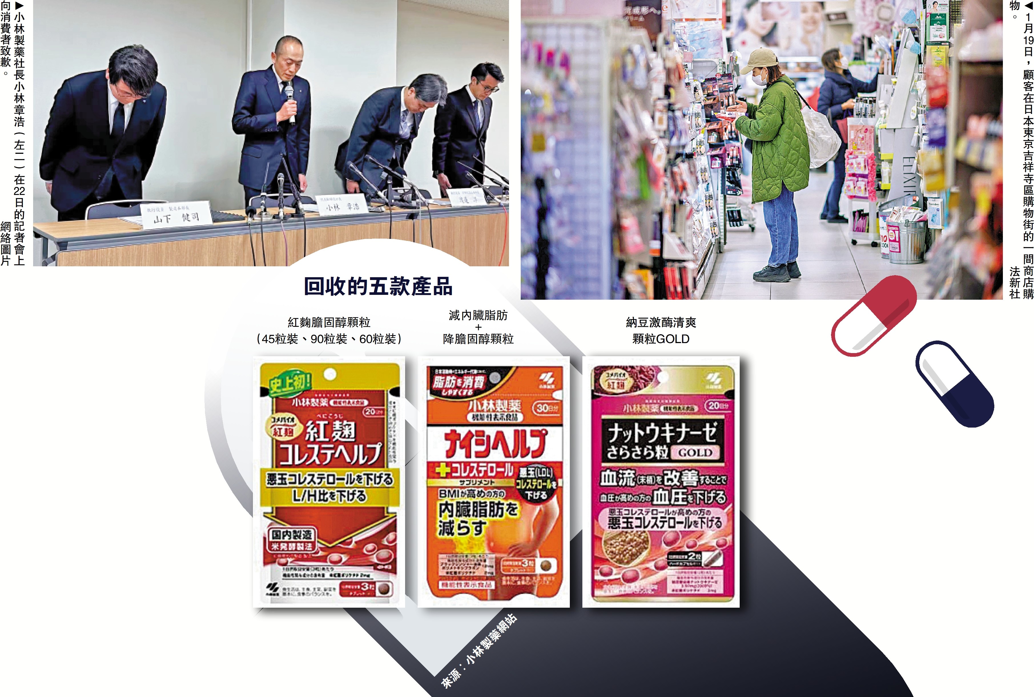 而回收的保健品之一「紅麴膽固醇顆粒」聲稱可以降低膽固醇水平。該產品自2021年在日本藥店販售,累計銷量接近110萬件,年銷售額達6億日圓。小林製藥自行回收約30萬件。