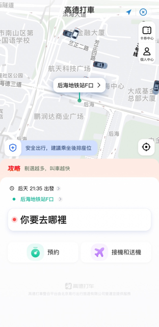 用戶只需於AlipayHK首頁上方搜尋「高德」或進入「交通」頁面並點擊「高德打車」標示,即可進入小程式,完成開通後輸入出發地及目的地,即可一鍵call車。計及AlipayHK早前經已經覆蓋本港所有公共交通工具、深圳地鐵巴士、廣州地鐵巴士、高鐵、跨境巴士和跨境call車等,全方位方便港人跨境出行。