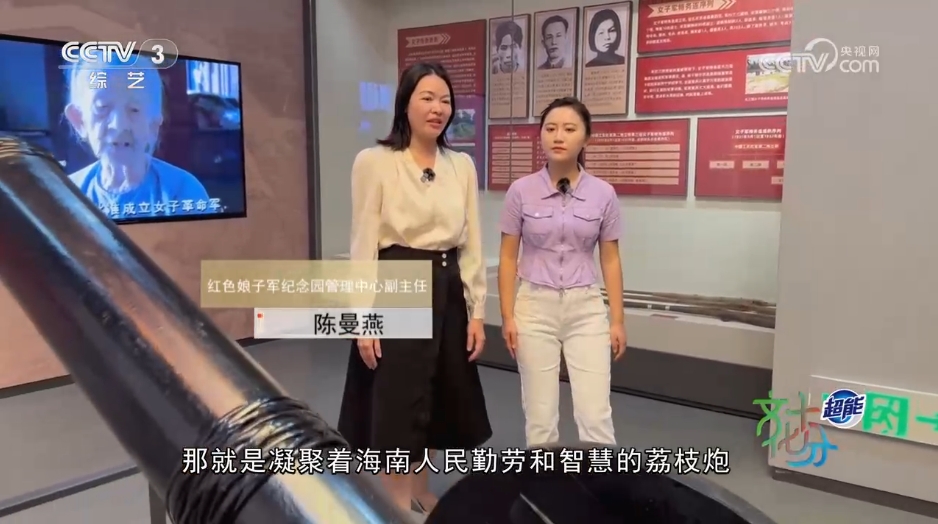 陳曼燕:這是我們「戰地瓊花」主題陳列展中最受歡迎的一個展品,那就是凝聚着海南人民勤勞和智慧的荔枝炮。在土地革命戰爭期間,我們瓊崖共產黨人所使用的兵器大部分是一些冷兵器,比如說大刀、長矛,還有粉槍,它們都只適合於近身搏擊,比如粉槍它的射程只有幾米。在武器非常匱乏的情況下,瓊崖的革命群眾非常地智慧,仿造大炮的形狀就地取材,選用堅硬的荔枝木研製成功了荔枝炮。在當時荔枝炮的射程能達到幾十米,極大鼓舞了我軍的士氣,在幾次戰鬥當中也屢立奇功。