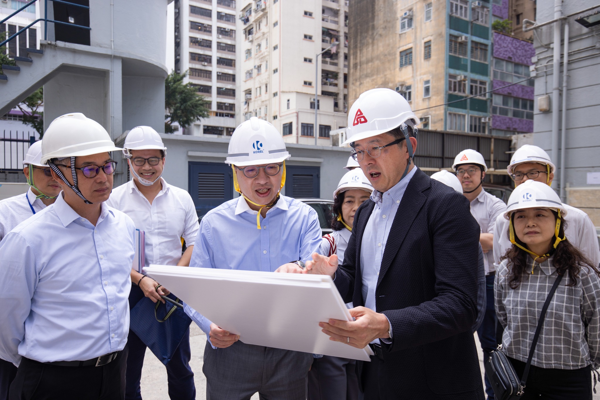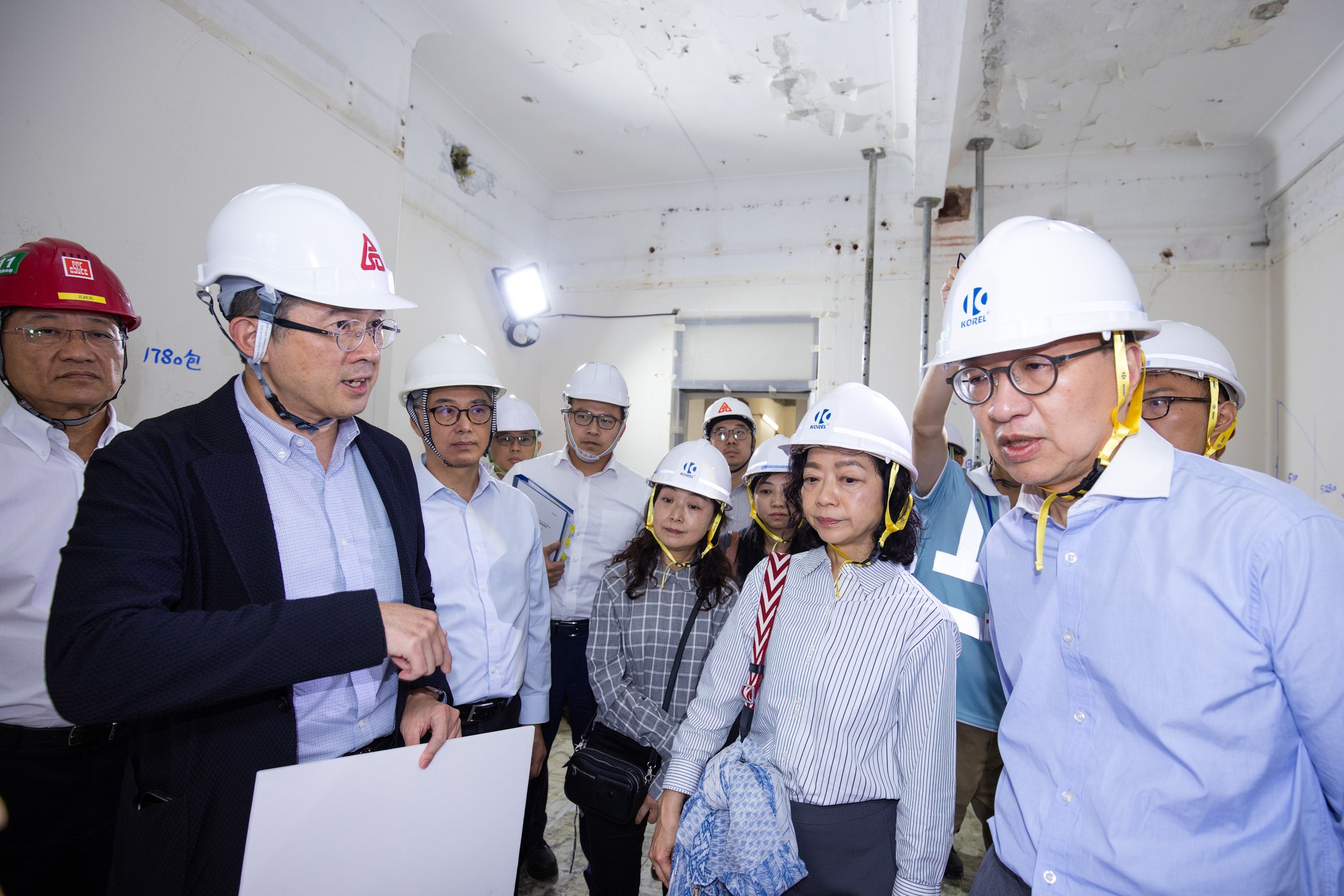林定國今日與律政司政務專員王學玲、發展局常任秘書長(工務)劉俊傑、建築署署長李翹彥等到舊灣仔警署工地視察,他指團隊爭分奪秒工作以確保這項重要項目可以準時明年底交付。