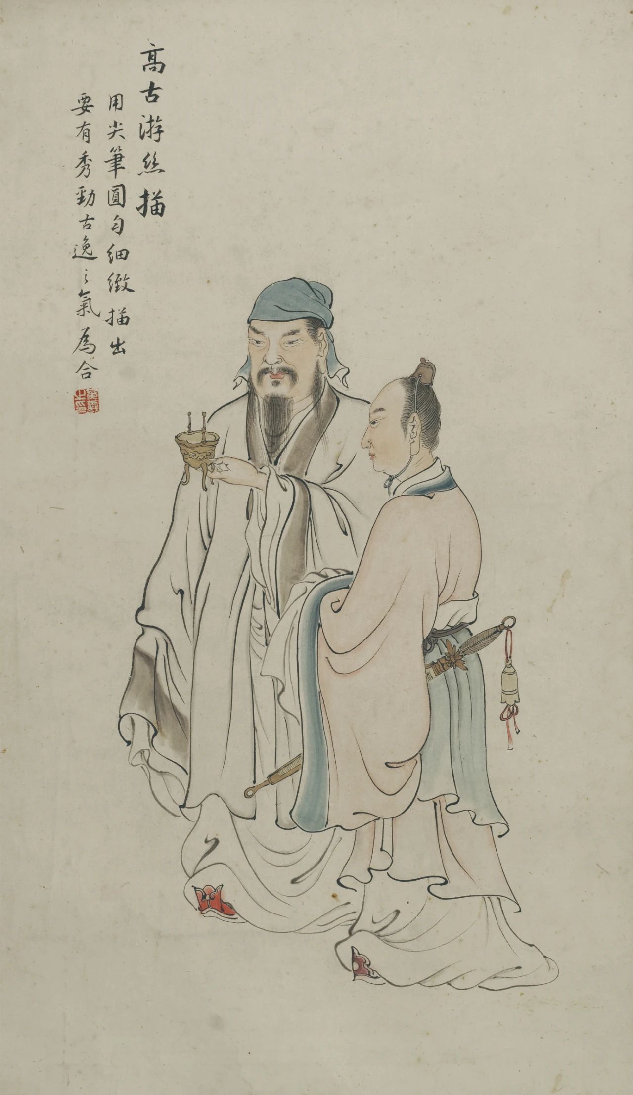 他畫的男性,或仙人、或隱士、或文人士大夫,皆能表現出人物的身份和氣韻。如《高士》《竹林七賢》中的人物,顯然是高雅脫俗、有修養、氣韻非凡之人。他畫的《高僧》,顯然是西域人的形象和氣韻。元趙孟頫曾說,畫西域僧人,要得西域人情態,不能畫成漢僧,黃羲就畫出了西域人的情態。他畫的《關羽》,威嚴中見其儒雅,有威武不可屈的感覺,背後的周倉,則是一介武夫,但也有剛猛不可犯之氣。