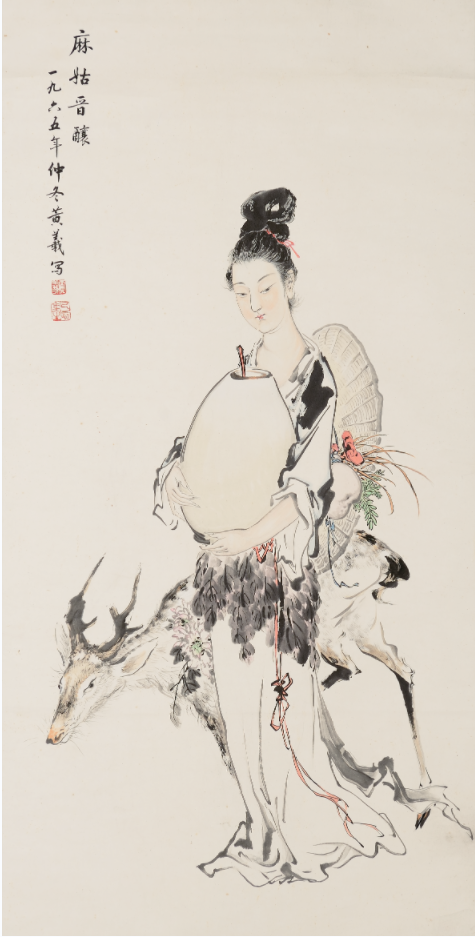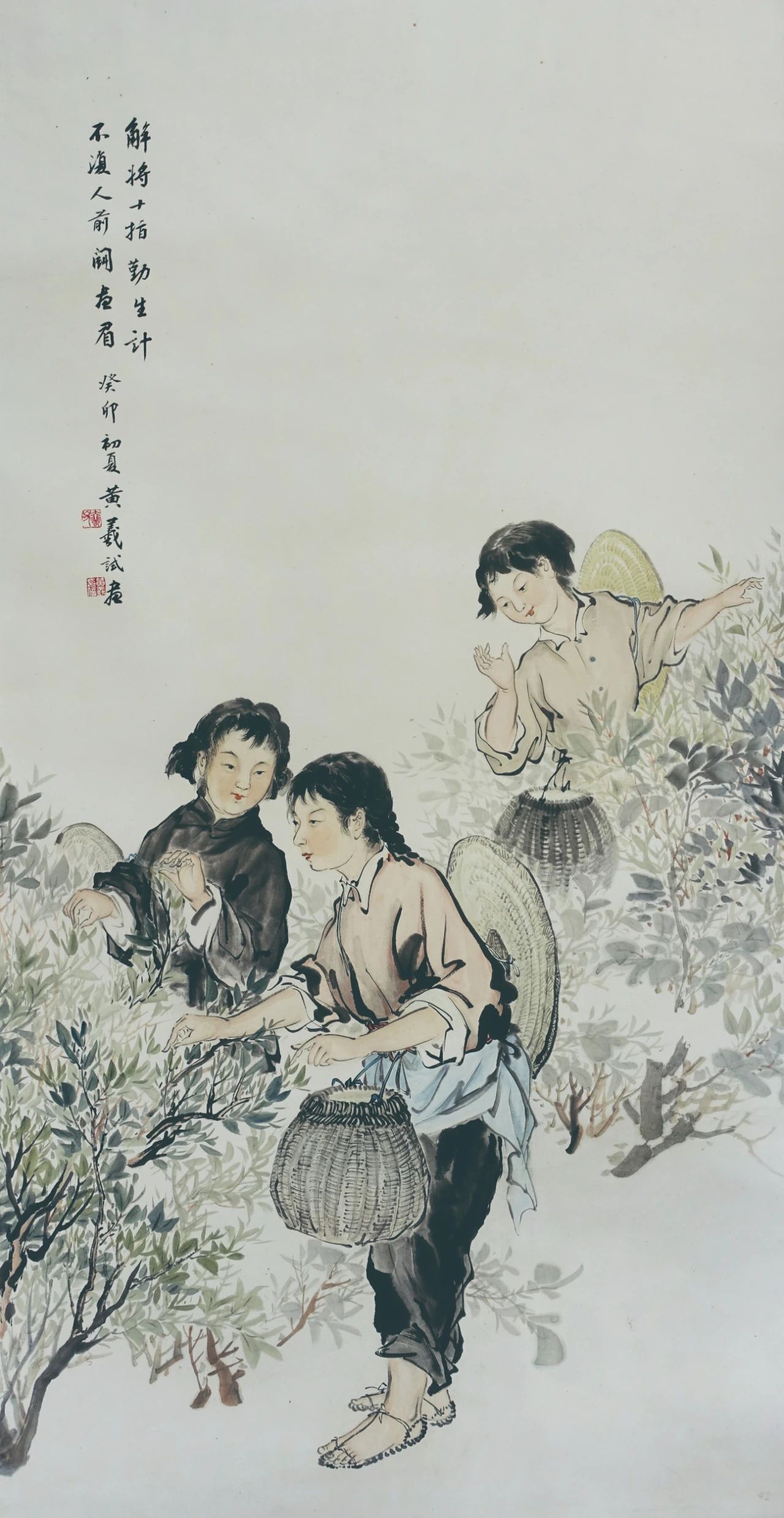 他在創作人物畫,特別是古裝人物畫的衣紋時,就更加精意。如他畫的《麻姑晉釀》,似曹衣描、鐵線描和混描幾種筆法的結合,左上部分又用大筆墨點挫幾筆,顯得古朴而流暢。《美人倚竹圖》則用遊絲描和琴線描筆法,顯得高古。《高僧》則用行雲流水描。《三折肱》則在古法基礎上變化,筆墨酣暢而大膽。古人的線描,一般不用大塊筆墨,黃羲《漁》《樵》《耕》《讀》《右軍書扇》《李時珍》等畫中常用大筆頓挫揮灑,大塊筆墨,以增加現代感。