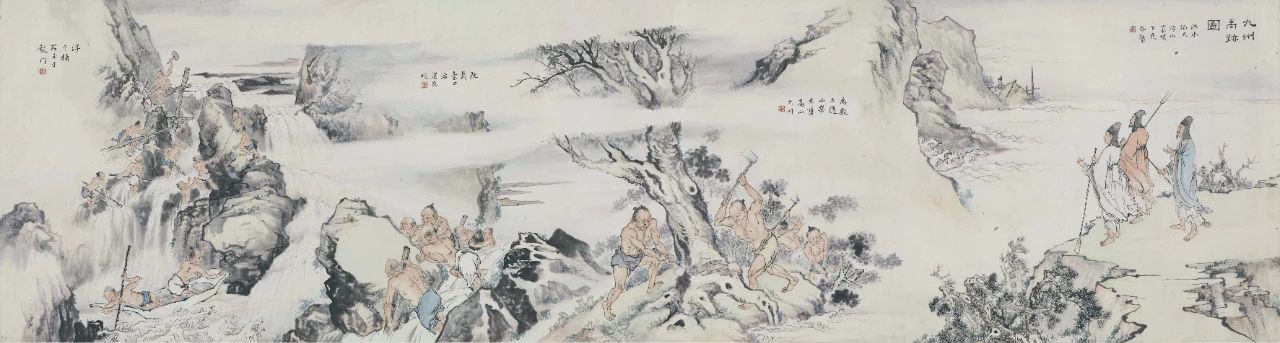 1961年,黃羲創作的18米長捲《九州禹跡圖》,是他的人物山水畫傑作。描繪的是大禹治水的經過,全畫分十段,每段表達一個主題,山水樹石為主,治水的人物在其間,畫得空曠而靈動,謹嚴而又氣勢磅礴,和人物樹木配合得和諧而得體。1968年,他畫的《黃山圖》《天柱峰圖》,則近於古典,用披麻、折帶、捲雲等皴法,用筆細勁而骨骾,靈活而嚴謹,和現代很多山水畫拉開了距離,顯示他的傳統功力之深厚。