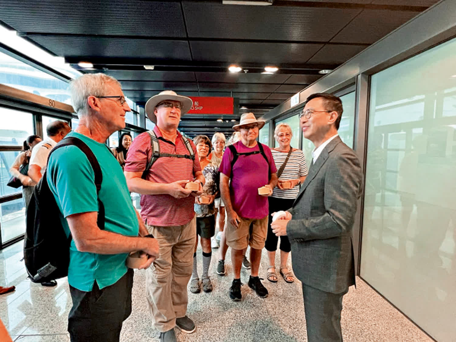 文化體育及旅遊局局長楊潤雄昨日上午到啟德郵輪碼頭,了解交通配套,並與旅客聊天,了解有關需要,又介紹「藝術三月」及香港重要景點。