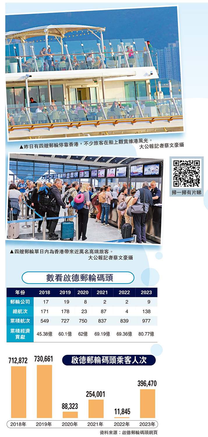 昨日共有四艘郵輪分別停泊啟德及尖沙咀,不少旅客搭乘巴士或的士外出遊玩。有旅客期望在船上或碼頭有更多途徑了解香港本土文化,打卡不同的特色地標,豐富旅遊體驗。