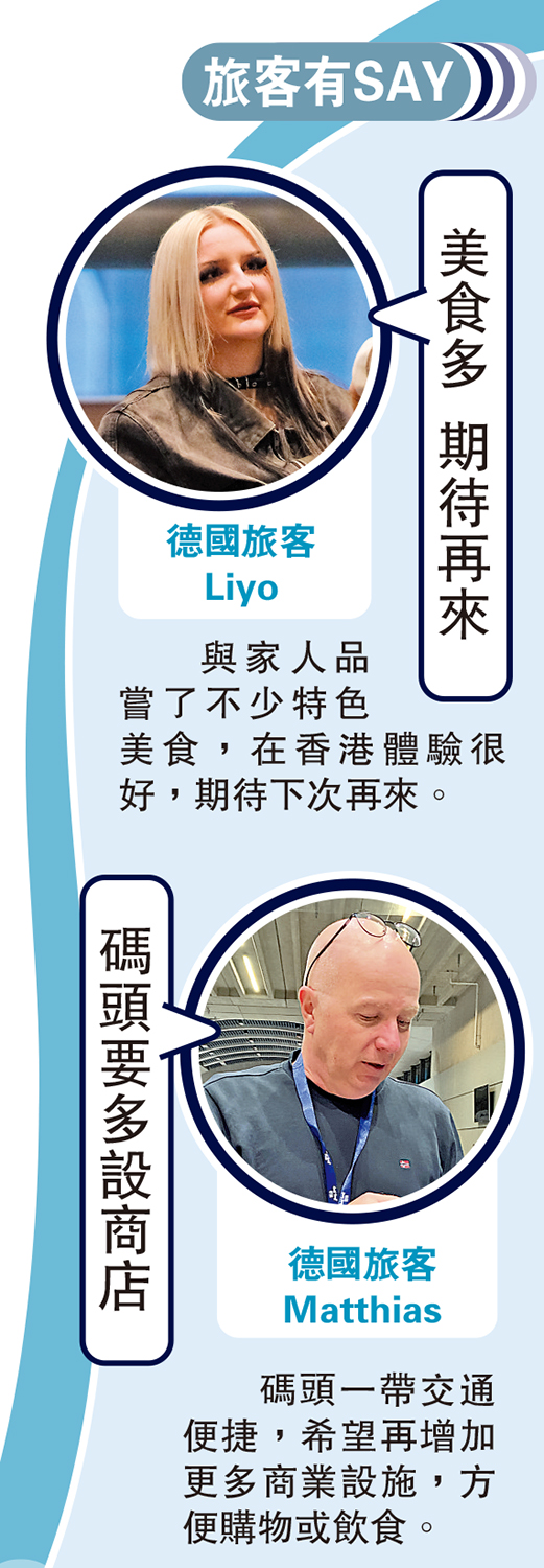 同樣來自德國的Matthias說,今次是首次訪港,去了尖沙咀、山頂、大澳等地方遊玩,他十分享受。不過就希望碼頭附近可以增加更多商業設施,方便旅客購物或飲食。