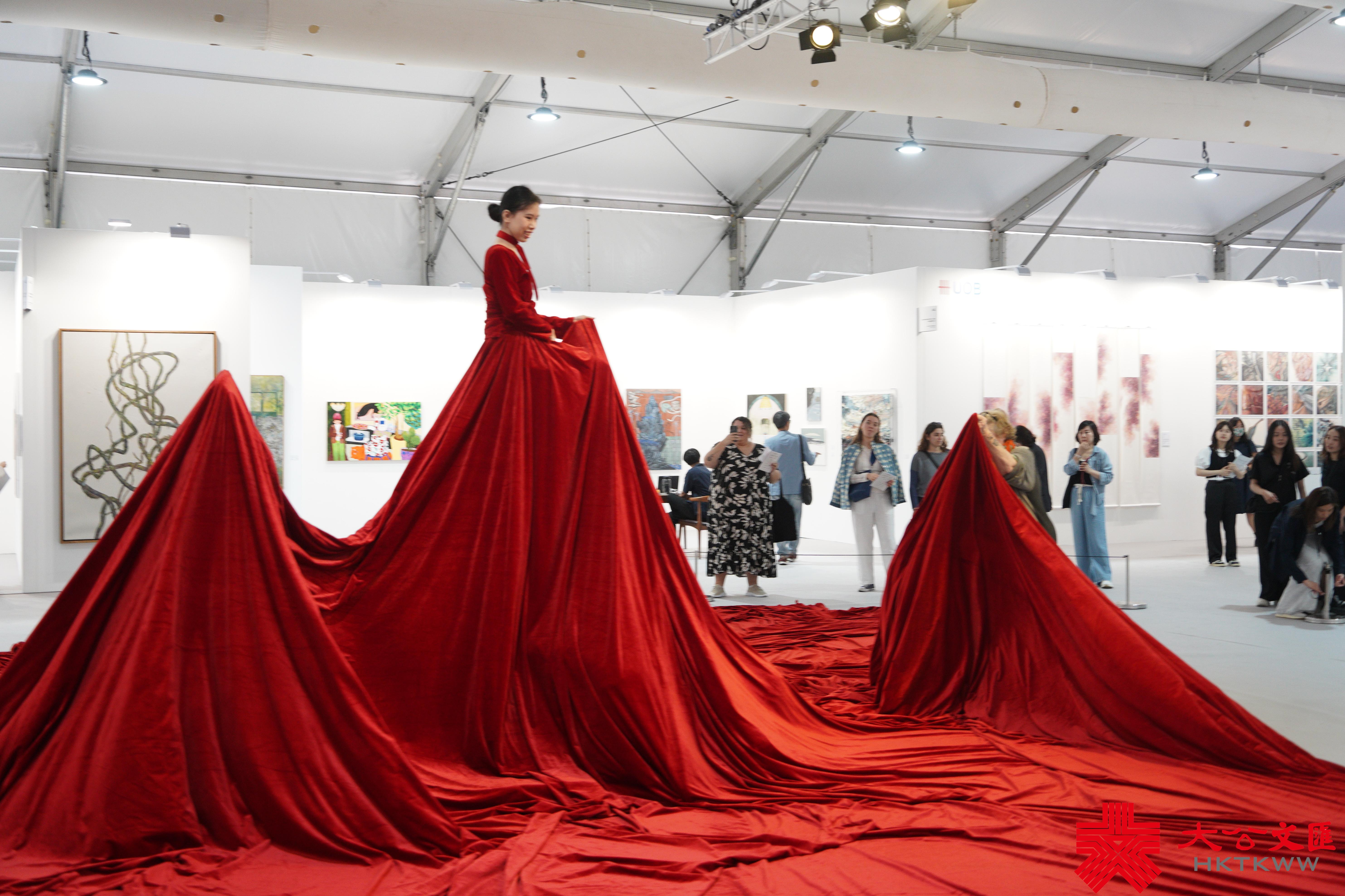 步入展會不久,就會被一襲覆蓋大範圍場地的紅色長裙奪去注意力。這是日本藝術家砂山典子(Sunayama Norico)表演藝術作品《むせか える世界》(A Sultry World),過去三十年間多次在世界各地上演,國際讚譽不斷。藝術家坐在裝置上,如同身穿深紅色長裙,而參加者則被邀請潛入其裙擺之下私密空間。裝置內瀰漫薰衣草紓緩香氣,介於公共與私人領域之間,為觀者營造片刻的寧靜。表演將一連五天在展會中持續演出,讀者可以親身到訪成為其「裙下之臣」。吸引觀眾深入一個奇妙的空間,遊走於公眾和私人之間的邊緣。