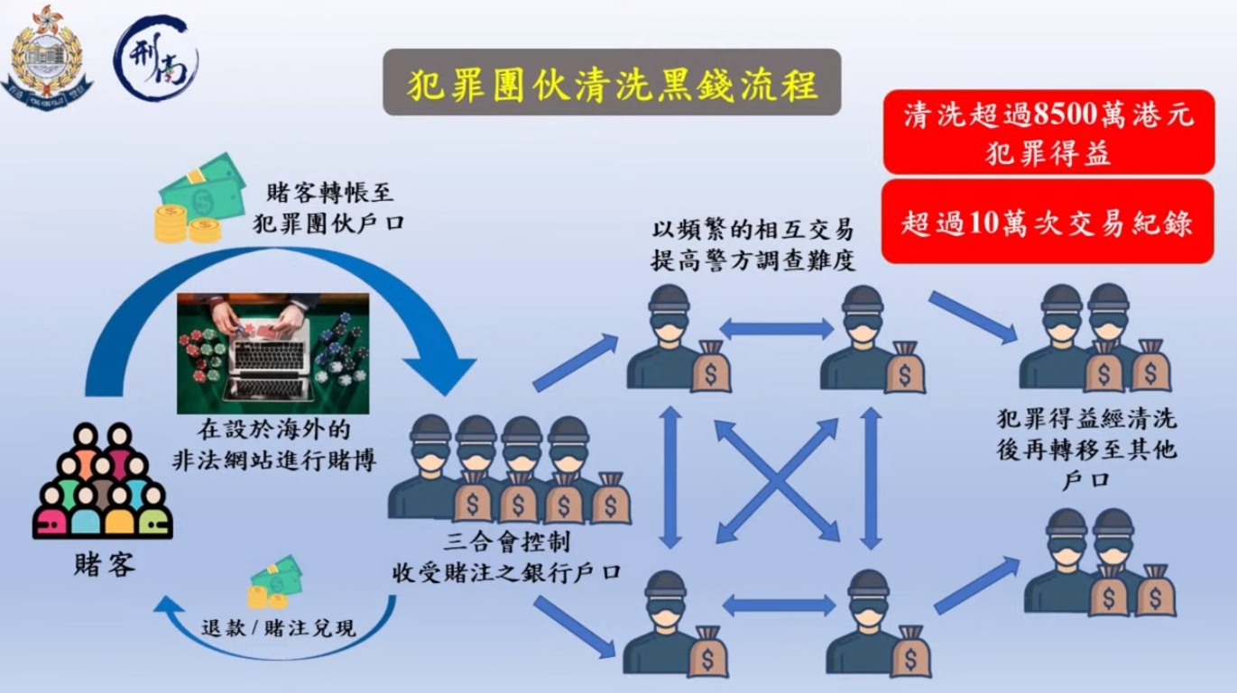 警方指,犯罪集團聲稱可以提供網上賭博服務,要求賭客轉賬資金至指定的銀行戶口,以兌換積分,在非法賭博網站使用。犯罪集團為掩飾犯罪得益的資金流向,短時間內利用多個戶口進行極頻繁及大量的互相轉賬。調查發現其中一個戶口,於半年內進行了多達超過4萬次交易,涉案的9個銀行戶口,合共有超過10萬次的可疑交易紀錄。