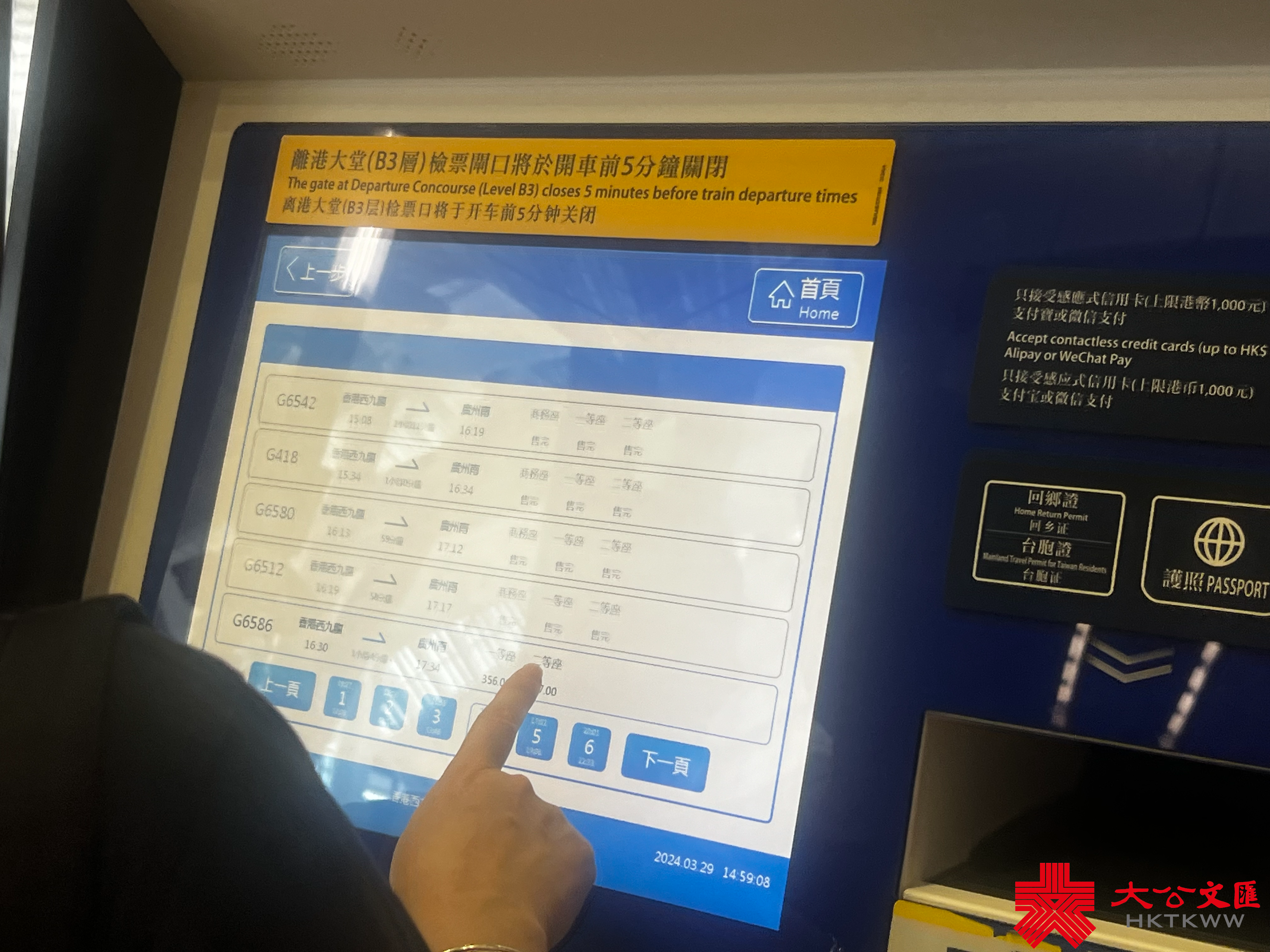西九龍高鐵站現場的售票區分為人工售票和自助售票,人工售票區的人流稍多,目測排隊時間需要至少20分鐘。在自助售票區的網絡購票頁面上,記者見到旅客所選擇的行程車票基本售罄。