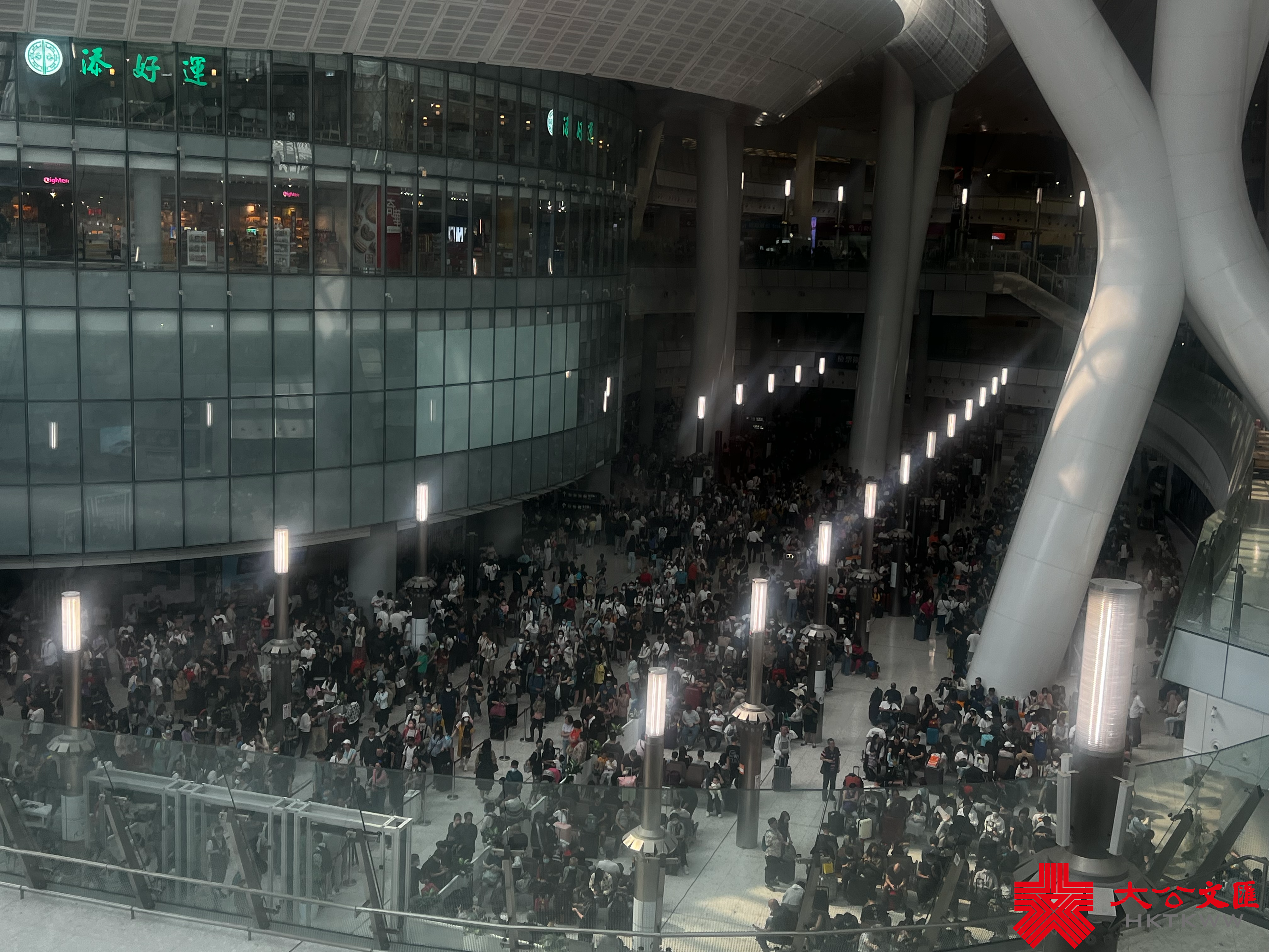 大公文匯全媒體記者在高處拍攝已經通過香港和內地兩道關口查驗的月台區域,只見人潮洶湧,明顯比購票和檢票區擁擠許多。