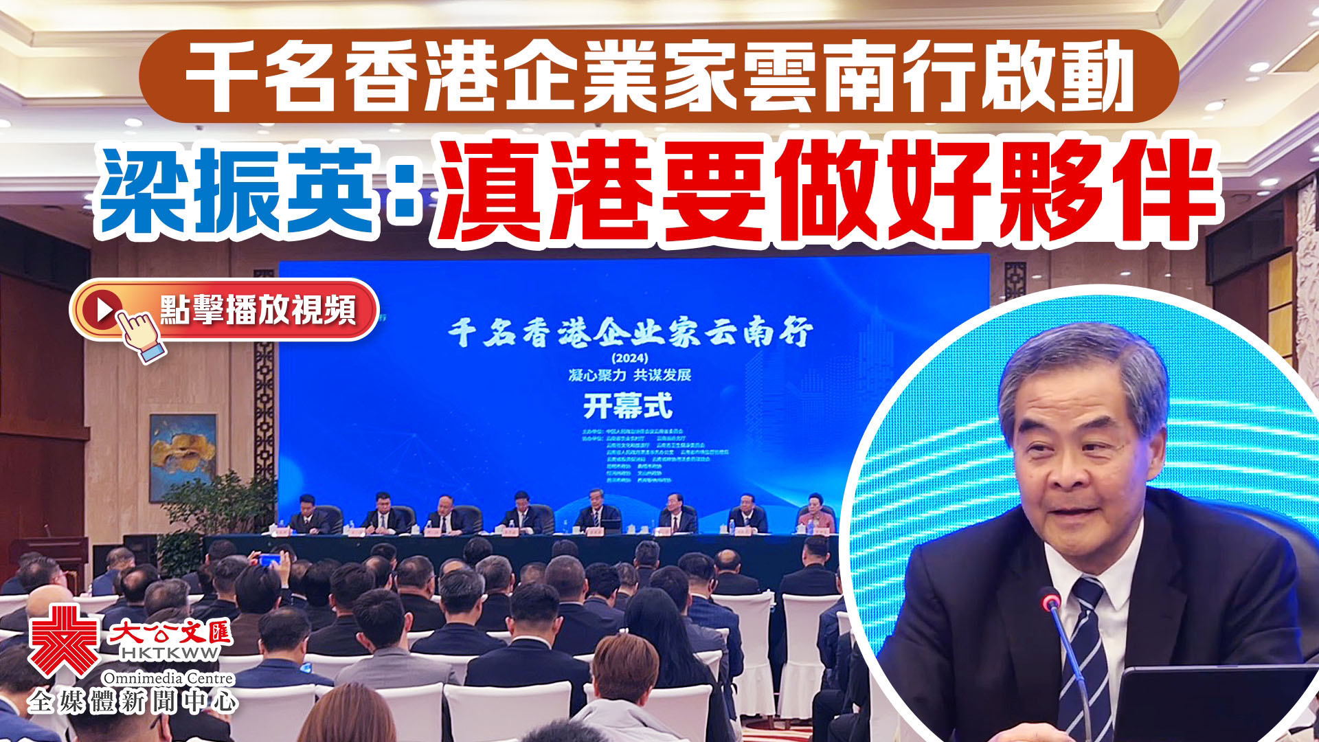 (大公文匯網 記者 譚旻煦、任青 昆明報道)3月29日下午,「千名企業家雲南行」(2024)在昆明啟動,全國政協副主席梁振英,雲南省委書記王寧,雲南省委副書記、省長王予波出席開幕式並致辭。梁振英表示,香港和雲南在各個方面的發展都是好夥伴,而「好夥伴」三個字後面,寫的不應該是句號,要寫逗號,雙方要共同努力,將滇港合作這篇文章共同寫好。