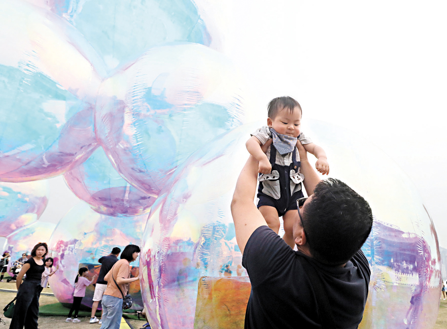 香港文匯報記者於下午再往西九文化區的大草坪,見到不少港人在草坪上撐起帳篷玩樂、休息或野餐,有不少家長帶同子女散步、吹波波或玩氣球,亦有部分市民帶狗仔出門。草坪中鋪設有幾個巨型肥皂泡泡造型的藝術裝置,不少港人在泡泡裝置前擺各種姿勢拍照打卡,藝術裝置旁邊還有跳舞表演,現場熱鬧非常,充斥着音樂聲與孩子的歡笑聲等。