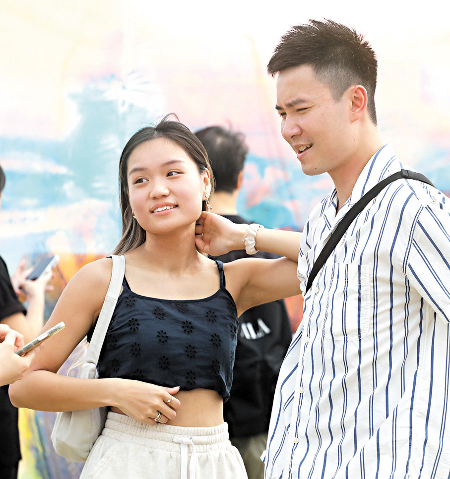 蔡先生與女友在泡泡裝置前面帶笑容拍照。雖說二人今次假期會留港,但他直言香港的商場沒什麼特色且其舉辦的活動比較適合小朋友玩,期望日後可於節日舉辦一些大型音樂節等適合成人參與的活動。