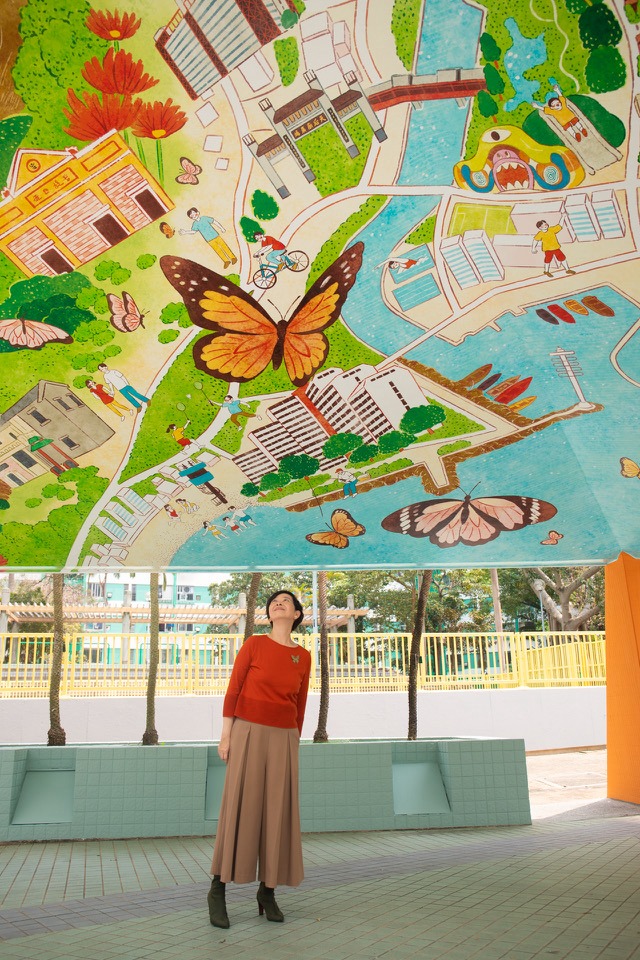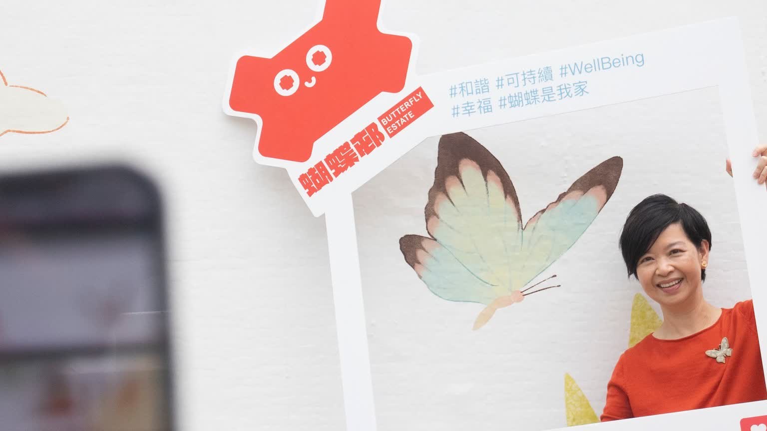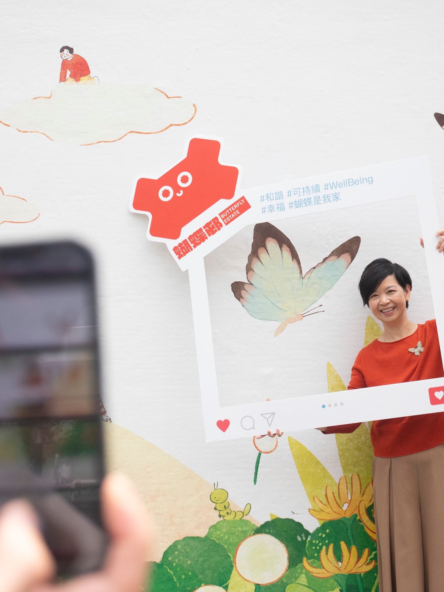 何永賢表示,屯門蝴蝶邨換上彩色新裝是「共築·幸福」下「幸福家族·繽FUN屋邨計劃」的成果,當中最具標誌性的是可供市民「打卡」的長壁畫。另外各大廈外牆亦有進行粉飾,以及以油漆翻新足球場等。
