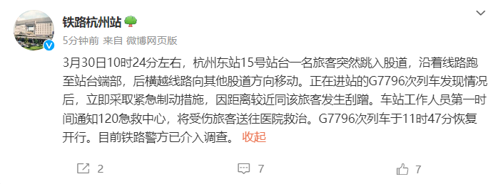 大公文匯全媒體報道,據「鐵路杭州站」消息,3月30日10時24分左右,杭州東站15號站台一名旅客突然跳入股道,沿着線路跑至站台端部,後橫越線路向其他股道方向移動。正在進站的G7796次列車發現情況後,立即採取緊急制動措施,因距離較近同該旅客發生刮蹭。車站工作人員第一時間通知120急救中心,將受傷旅客送往醫院救治。G7796次列車於11時47分恢復開行。目前鐵路警方已介入調查。