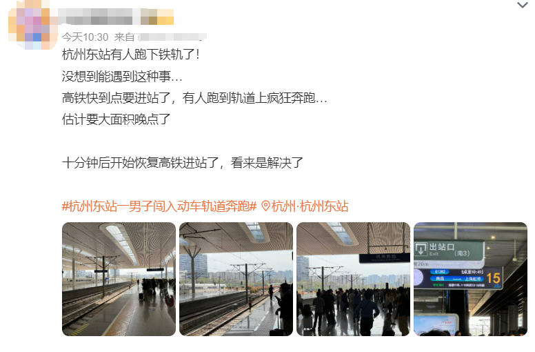 據杭州交通918消息,3月30日,杭州東站一男子闖入動車軌道奔跑,杭州東站列車大面積晚點,候車大廳人山人海。