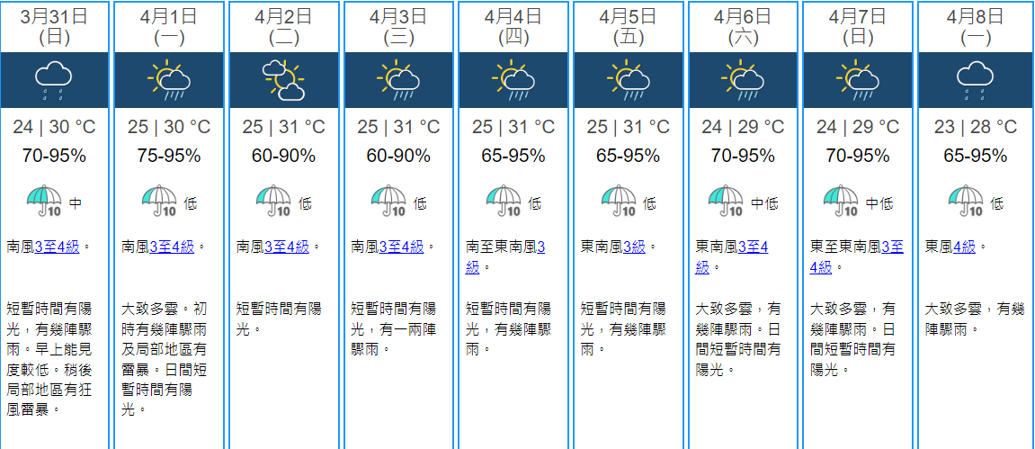 展望明日間中有驟雨及雷暴,隨後數日短暫時間有陽光及炎熱,亦有一兩陣驟雨。