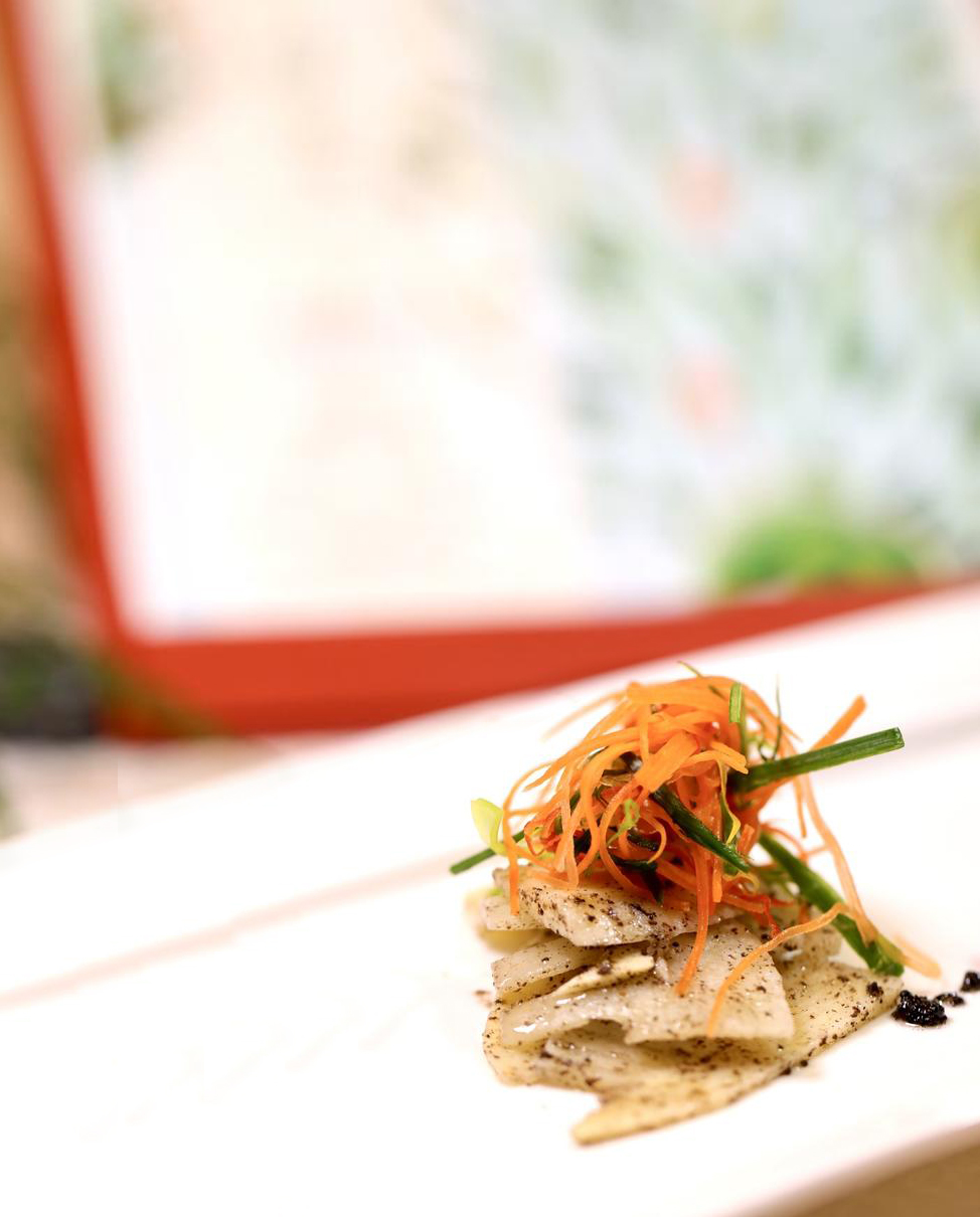 黑松露,食材界的王者地位,雖然黑乎乎其貌不揚,但富含多糖類物質,具有抗氧化、抗衰老、抗疲勞、增強免疫力、提高睡眠質量等多種作用。由於黑松露濃鬱霸道,任何食材在它面前都淪為配角,陳國雄別出心裁地選擇當季新筍,一黑一白,兩者融合,開發出一道黑松露炒春筍,口感清新,味道柔軟,香氣濃郁,深受顧客喜歡。