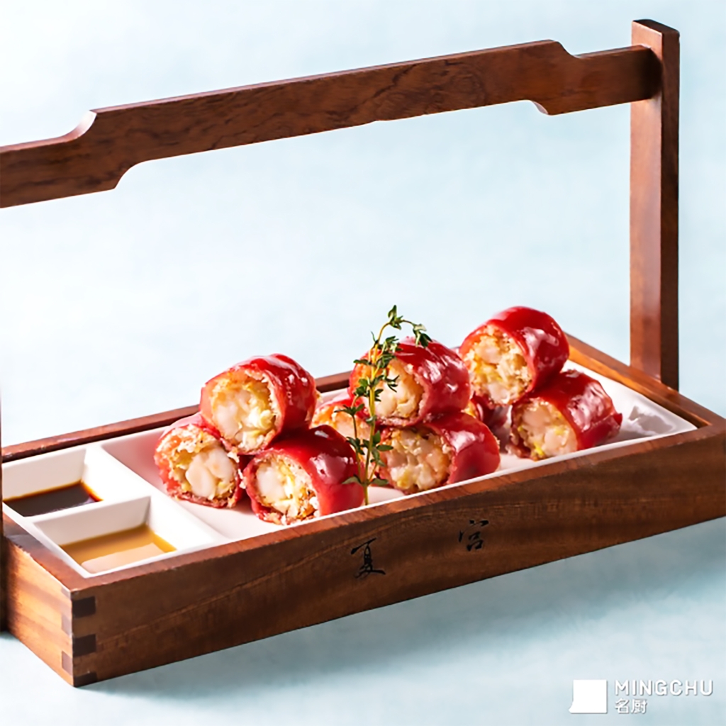 這道菜的首創者就是陳國雄。陳國雄來廣州香格里拉酒店任行政總廚後,思考最多的一個問題是如何推出顧客青睞的健康食品?他盯上了粵菜中最具代表性的菜肴之一腸粉。起初,陳國雄嘗試以胡蘿蔔、紫椰菜和黑芝麻等食材改良腸粉,但結果不太理想。有一年夏天他乘飛機去馬拉西亞度假,翻閱機上雜誌時,在一篇文章中讀到一句話:「動物愛綠色,人類喜紅色。」他腦中靈光一閃,對呀,什麼顏色更能挑起人們的食慾呢?答案是紅色!