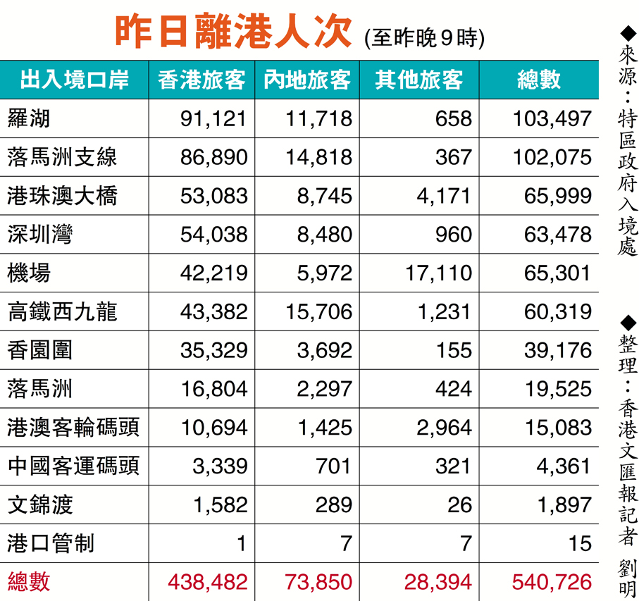 (香港文匯報 記者 劉明)昨日復活節假期第二日續有港人北上消費和外遊,但人數較首日離港高峰期後已有減少,截至昨晚9時約有54萬人次經各出入境口岸離港,其中43.8萬為香港居民(見表)。入境處預計明天(4月1日)復活節最後一天假期為入境高峰期,估計約58.9萬人次入境。