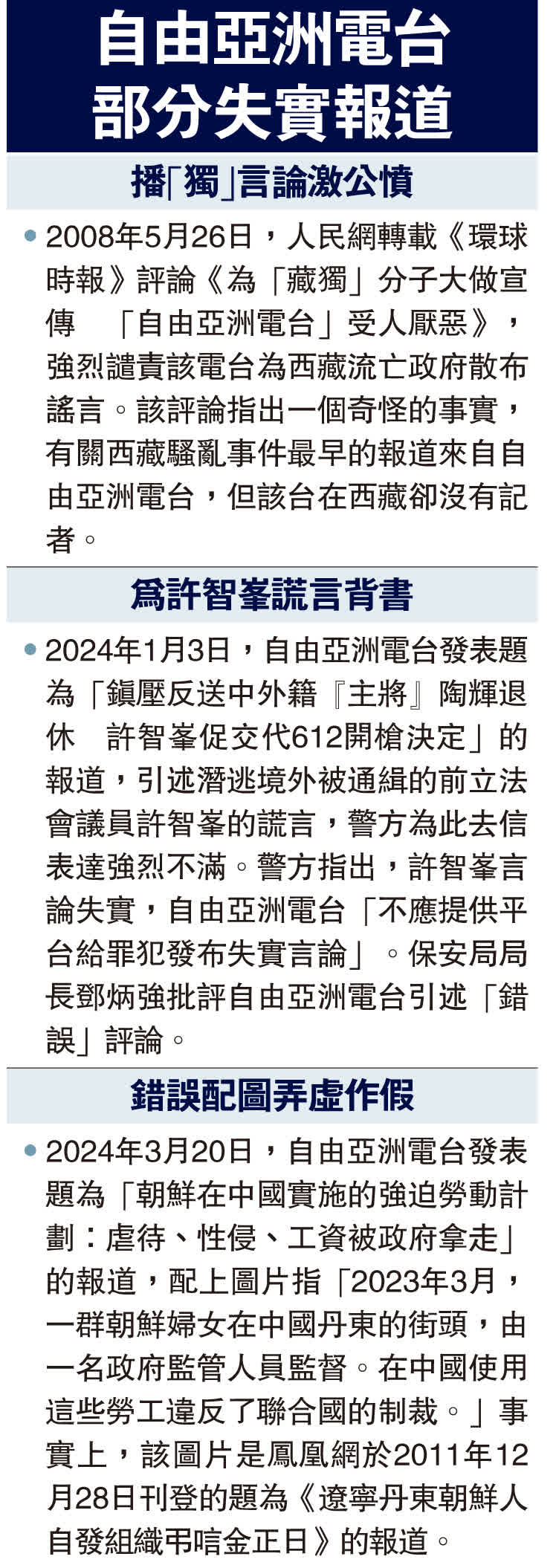 全國港澳研究會理事、法學教授傅健慈指出,自由亞洲電台以政治立場先行,違反新聞工作者的專業守則,多次抹黑《維護國家安全條例》立法及發表撤離聲明,作賊心虛,危言聳聽,煽惑人心,製造恐慌,邪惡目的昭然若揭,根本是新聞業界的敗類,必須予以強烈譴責。