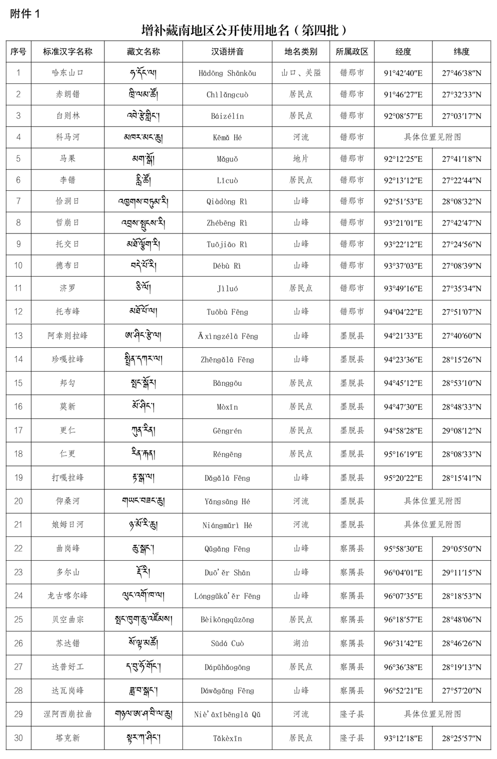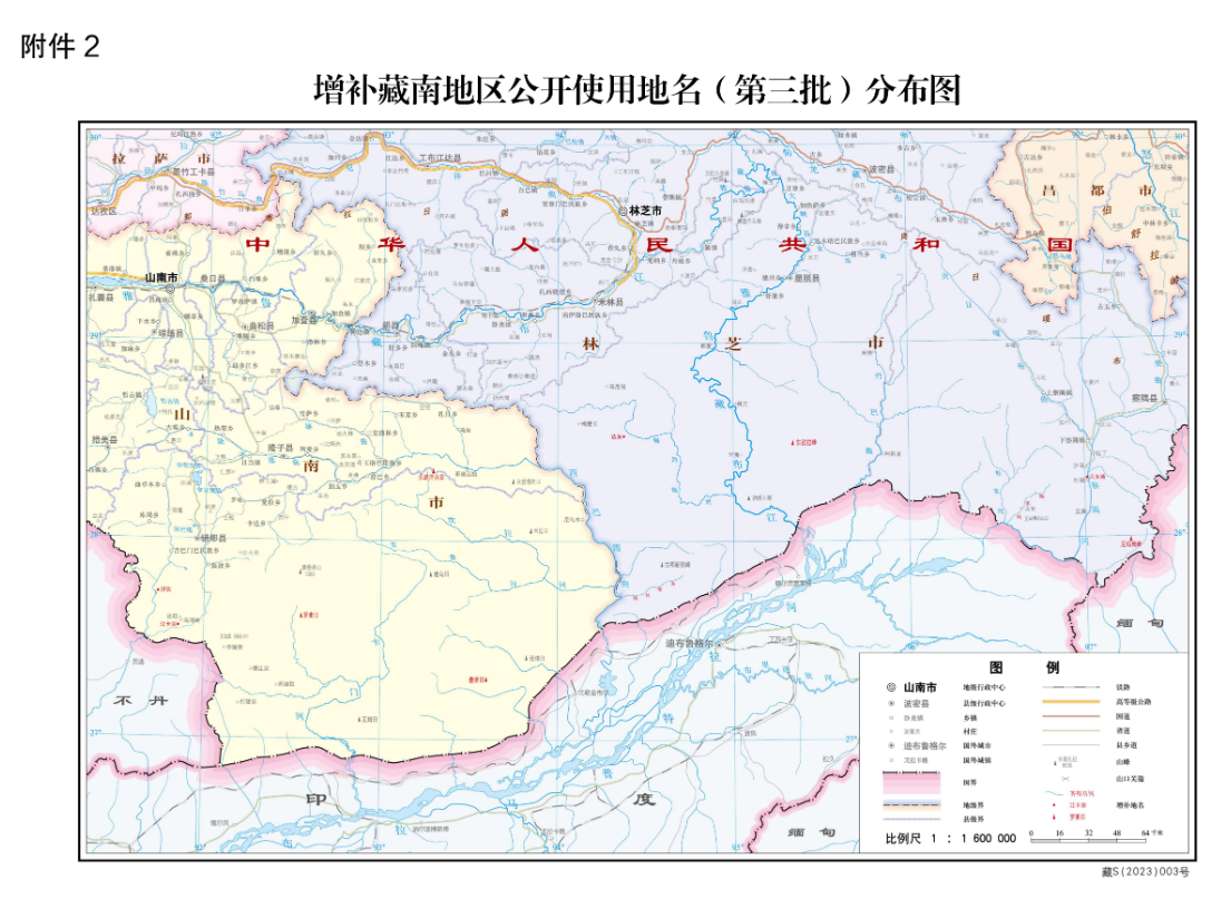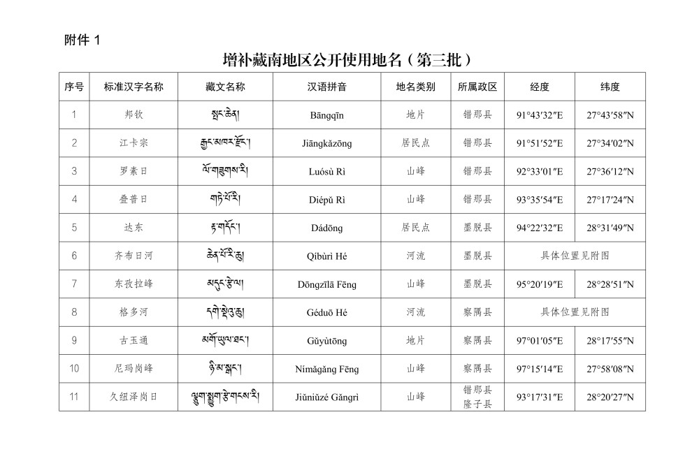 2023年4月2日,民政部發布公告,根據國務院地名管理的有關規定,民政部會同有關部門對我國藏南地區部分地名進行了標準化處理。並正式公布第三批增補藏南地區公開使用地名(共11個)。