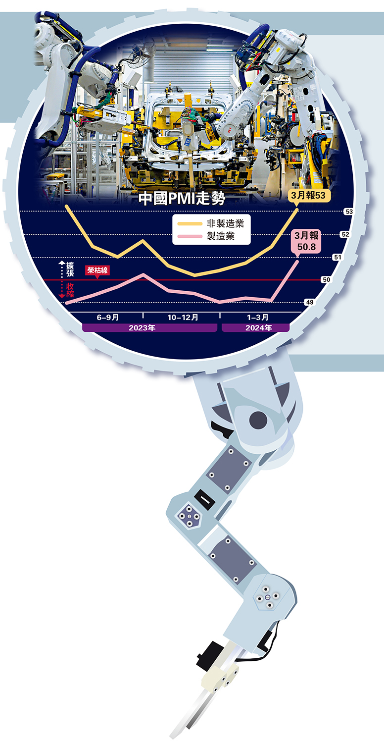 (大公報記者 倪巍晨 上海報道)國家統計局數據顯示,3月份製造業PMI(採購經理指數)報50.8,較前值提升1.7個百分點,時隔5個月重返擴張區間,亦為去年4月以來新高。分析稱,中國經濟活動擴張步伐的不斷提速,增強了內需復甦動能,企業、居民信心持續得到修復,消費與投資意願亦在增強,一季度中國經濟表現明顯優於去年四季度。