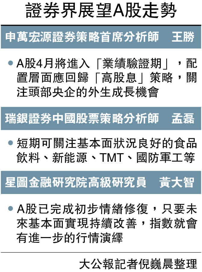 (大公報記者 倪巍晨 上海報道)A股3月呈現震盪緩步向上行情。分析稱,A股4月或進入「業績驗證期」,市場反彈或仍延續,惟幅度或較小,建議關注高息股企業、頭部央企,或基本面狀況良好的食品飲料、新能源、TMT、國防軍工等板塊。