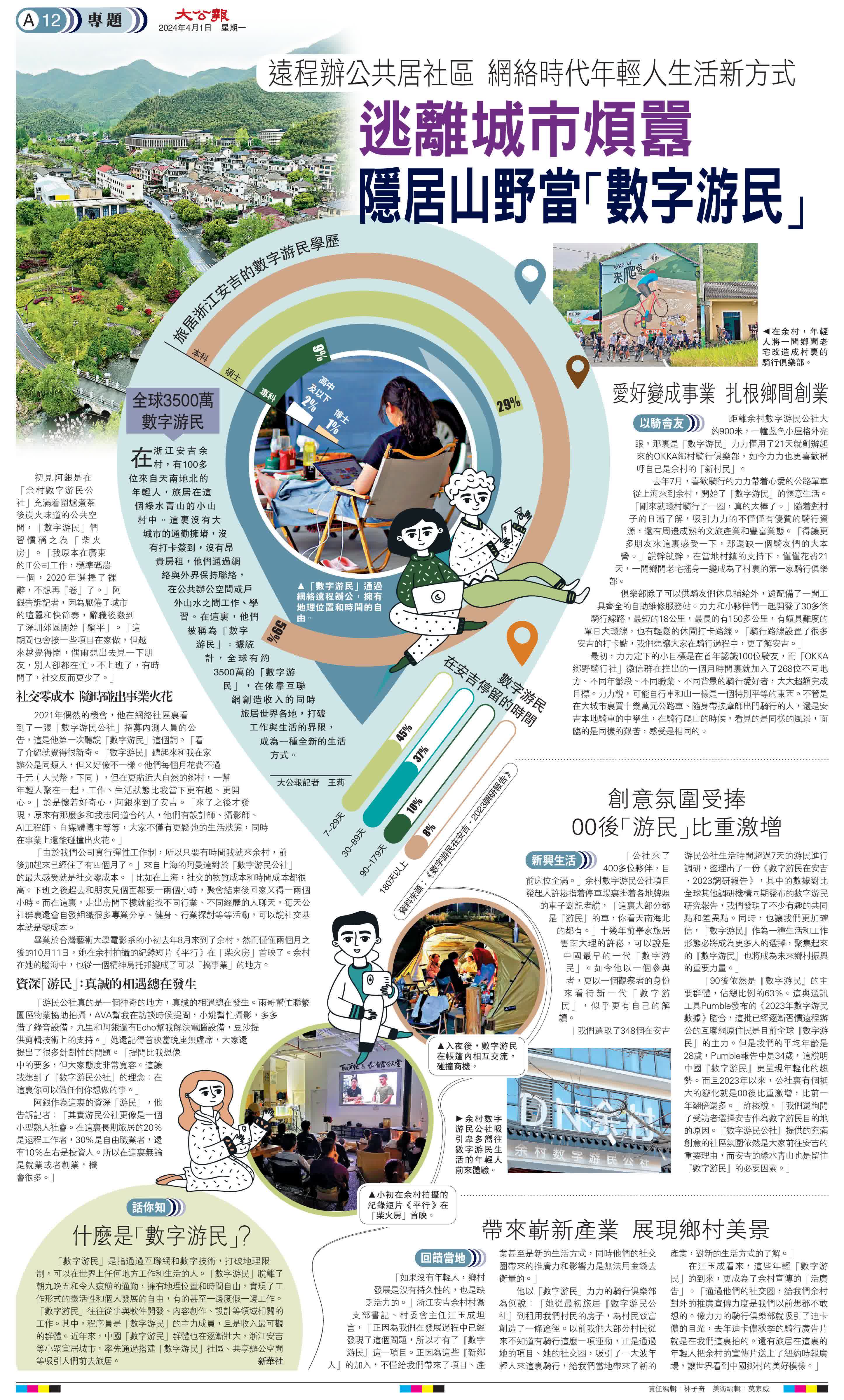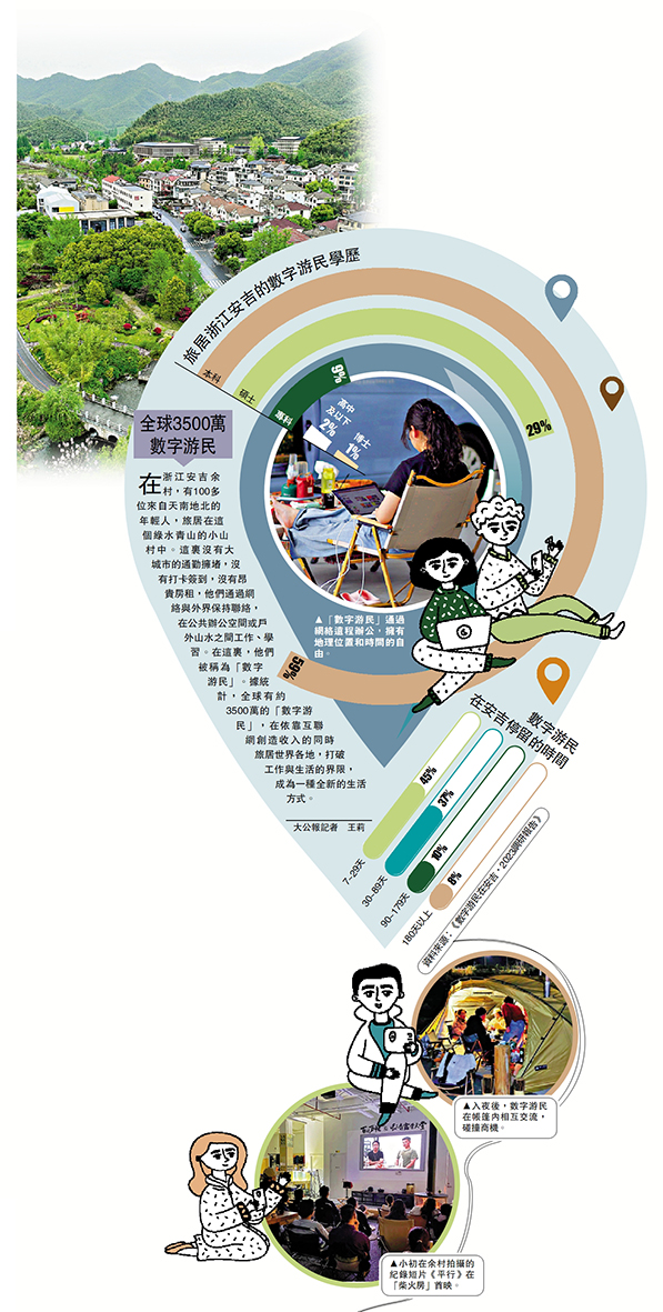 (大公報記者 王莉)在浙江安吉余村,有100多位來自天南地北的年輕人,旅居在這個綠水青山的小山村中。這裏沒有大城市的通勤擁堵,沒有打卡簽到,沒有昂貴房租,他們通過網絡與外界保持聯絡,在公共辦公空間或戶外山水之間工作、學習。在這裏,他們被稱為「數字游民」。據統計,全球有約3500萬的「數字游民」,在依靠互聯網創造收入的同時旅居世界各地,打破工作與生活的界限,成為一種全新的生活方式。