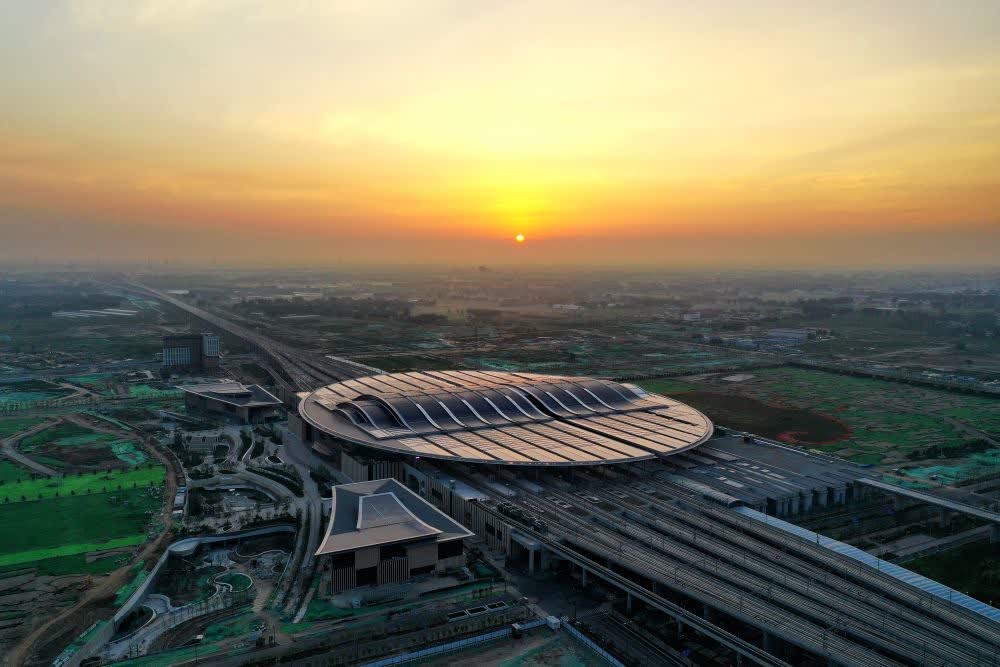 雄安站毗鄰白洋淀,從高處俯瞰,外觀呈水滴狀橢圓造型,恰似一滴青蓮上的露珠。從這裏出發,19分鐘可達北京大興國際機場,50分鐘可達北京西站,雄安融入首都1小時交通圈。在這裏航拍時,我常常利用日出、日落與站房相映襯,將建築的宏壯進一步彰顯。