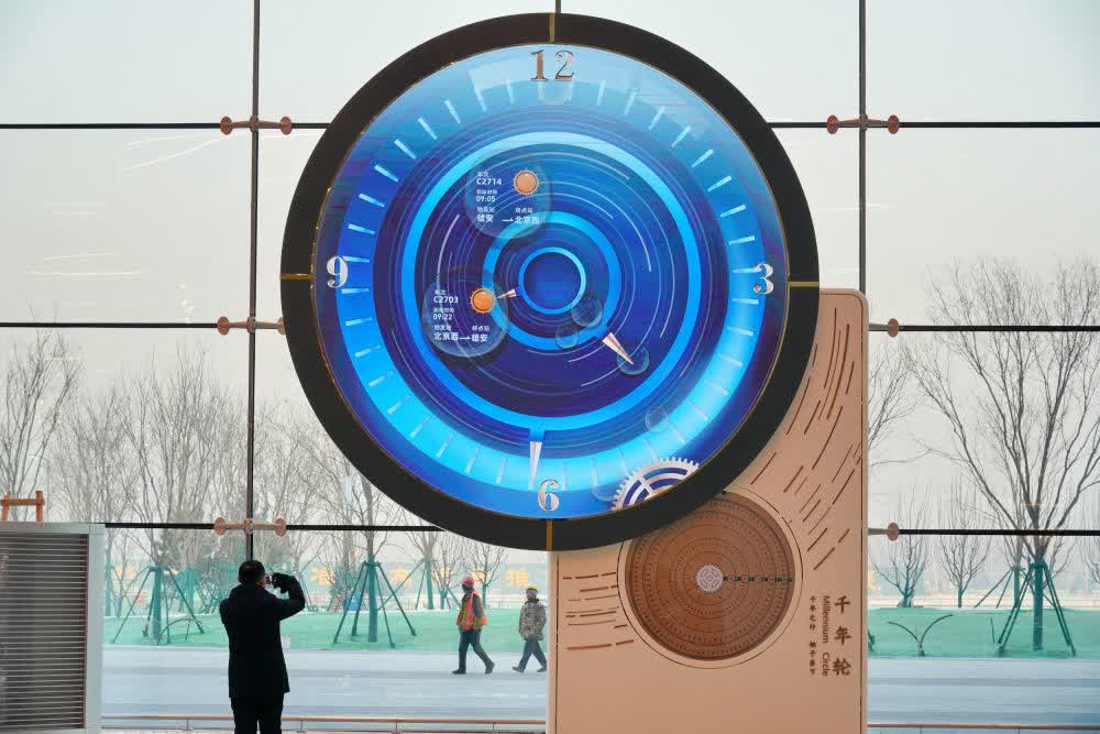 雄安站候車廳,一座「千年輪」吸引着往來旅客的目光。它的起始日期被設定為2017年4月1日——「雄安」第一次被公眾知曉的日子。「千年輪」的底座上,鐫刻着8個金色大字——「千年之計 始於當下」。齒輪不停地轉動,記錄下歷史前進的軌跡。
