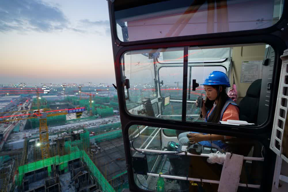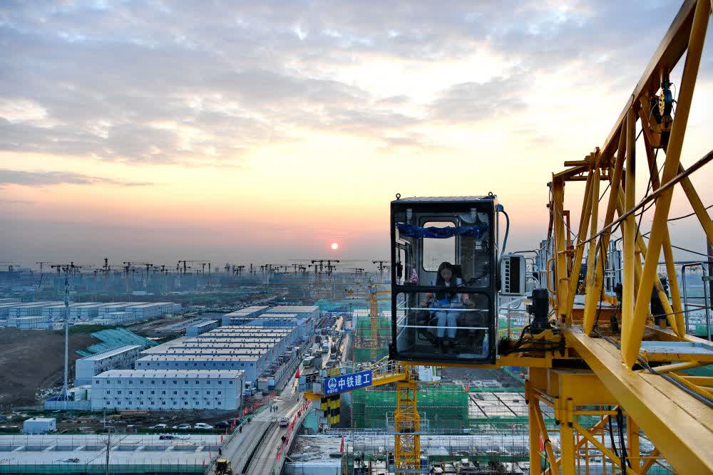 為了更好地突出這對「塔吊夫妻」的工作場景,有一些恐高的我站在塔吊臂上一個不足1平方米的變輻小車內,由阿洛春梅操作將我推至塔吊臂頂端。夕陽西下,落日、塔吊、建築與工作間內的阿洛春梅搭配在一起,雄安新區「拔節生長」之貌與建設者不舍晝夜的奮鬥之姿充分彰顯。