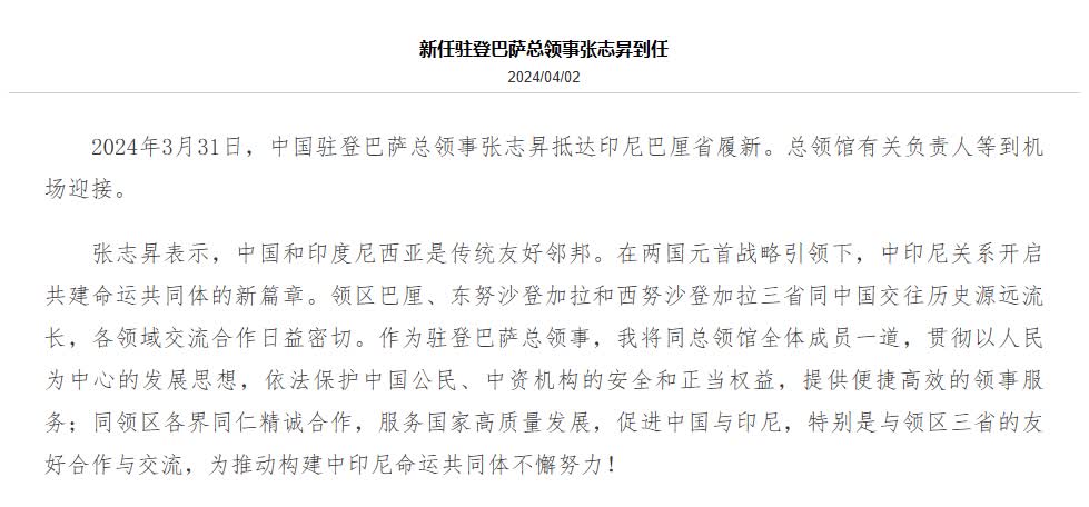 中國駐登巴薩總領館2日發布消息,2024年3月31日,中國駐登巴薩總領事張志昇抵達印尼巴厘省履新。總領館有關負責人等到機場迎接。