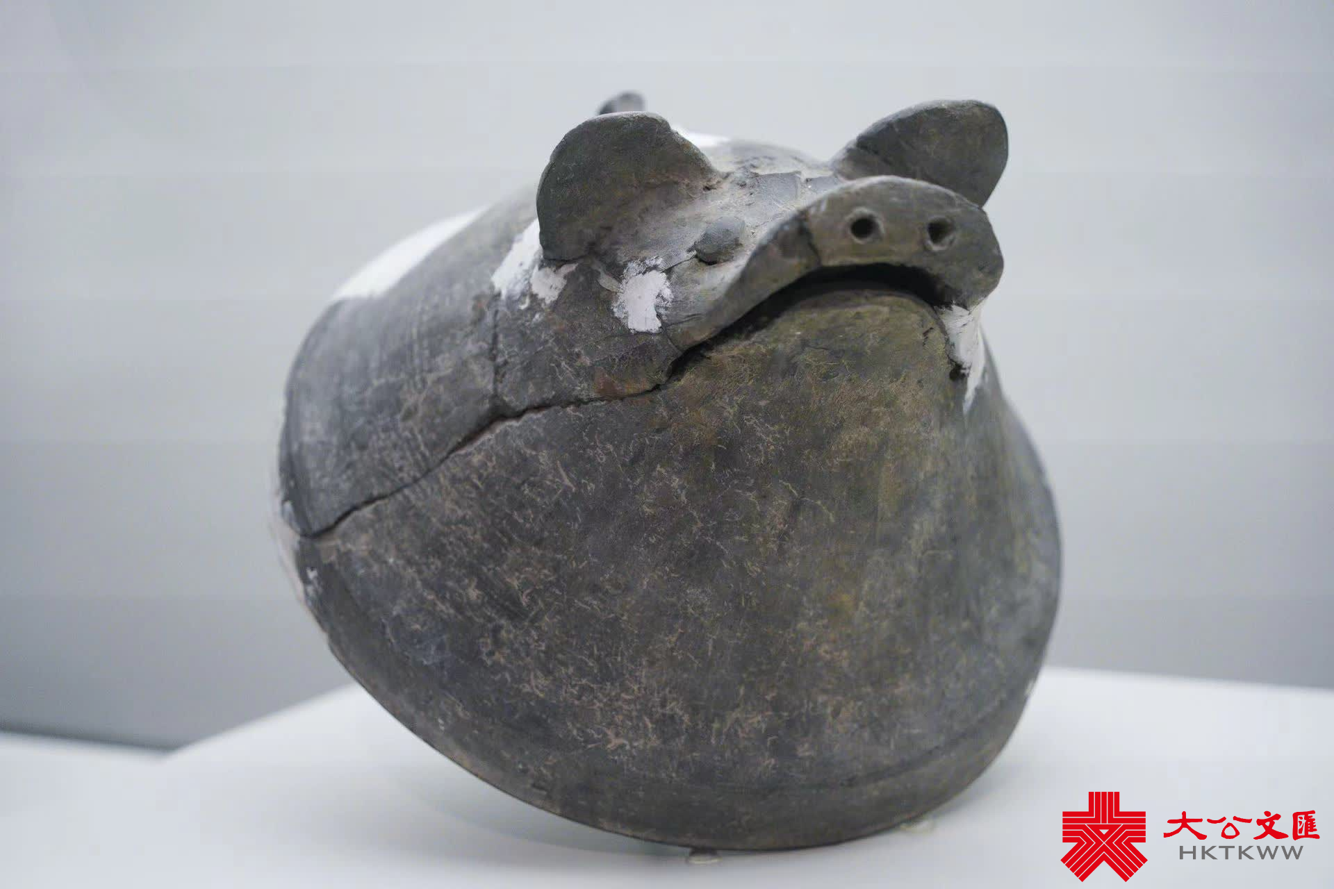 在預展中,記者發現了一件造型有趣的展品,陶豬頭蓋。其以泥質灰陶製作,以雕塑和刻劃手法塑造,將蓋頂部分塑造成豬頭形狀,五官惟妙惟肖,尤其是把豬嘴置於蓋頂,融藝術性與實用性於一體。陶豬頭蓋出土於新砦遺址祭祀遺跡附近,不見使用及磨損痕跡,推測是祭祀器具。