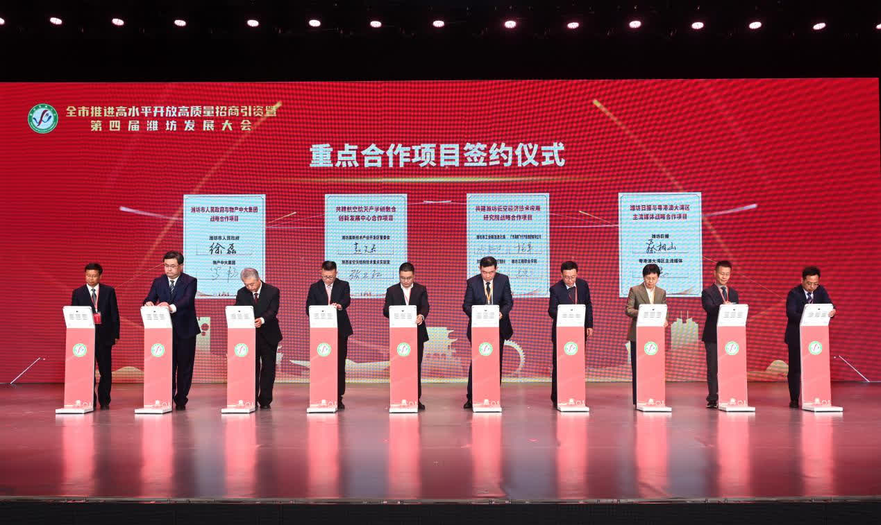 活動現場,山東(濰坊)華僑開放發展試驗區正式揭牌,濰坊市政府與上海交通大學、山東大學等簽署合作協議,山東大學和濰坊學院校際合作、濰坊日報社與粵港澳大灣區媒體戰略合作、濰坊市政府與物產中大集團戰略合作及共建航空航天產學研融合創新發展中心等重點項目集中簽約。
