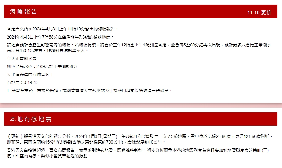 大公文匯全媒體綜合報道,台灣花蓮縣海域今早(4月3日)7時58分發生7.3級地震,其後發生多次餘震,香港天文台亦接獲超過100名市民報告,表示感到這次地震,震動維持數秒。天文台於上午11時10分發出海嘯報告,若海嘯持續,將於正午12時至下午1時到達香港,不過預料對香港影響不大。