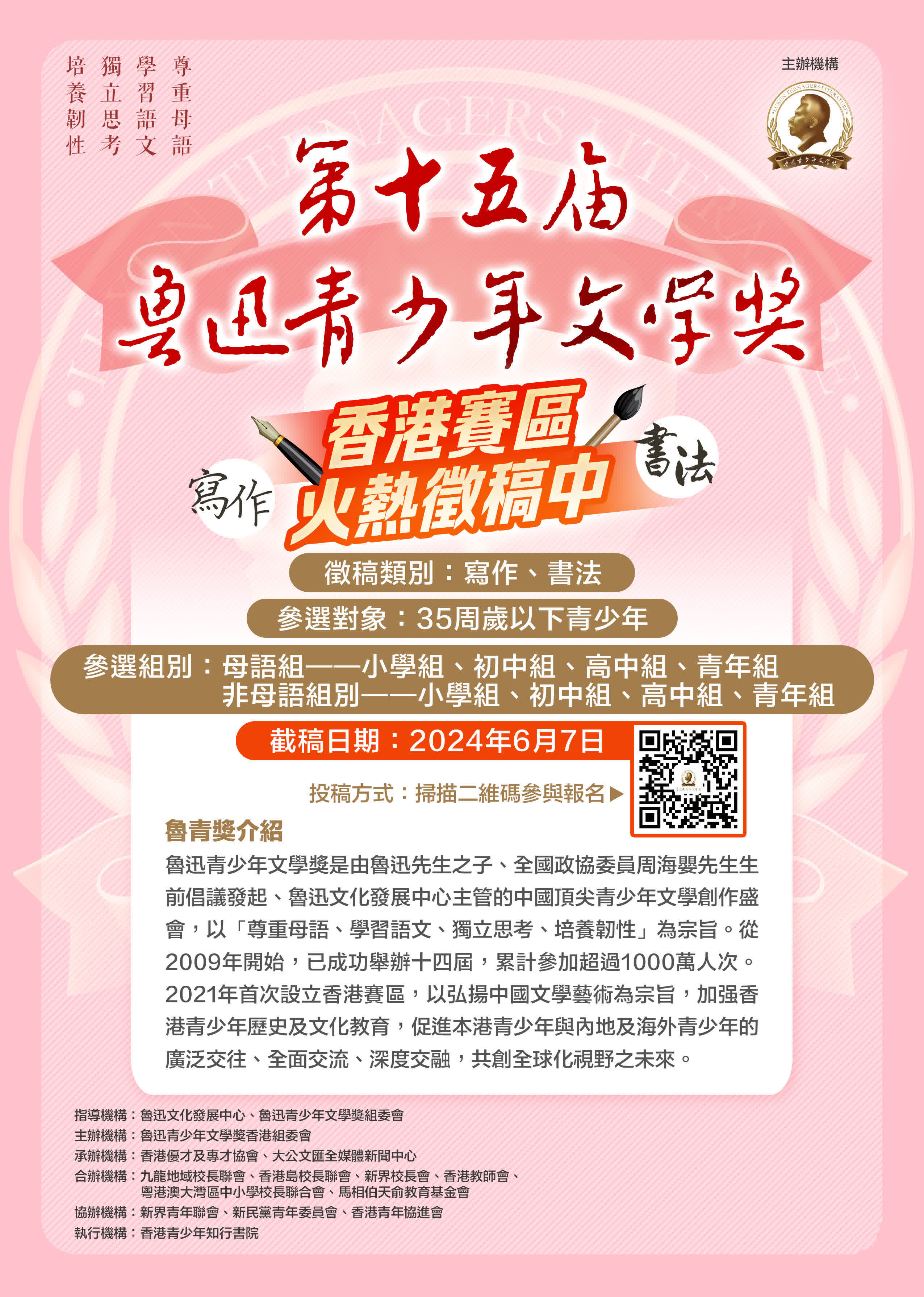 2024年魯青獎香港賽區比賽包括中文寫作、硬筆書法及毛筆書法三個比賽類別,參賽組別分為小學組、初中組(中一至中三)、高中組(中四至中六)及青年組4個組別。除此之外,為鼓勵更多非華裔學生及青年學習中文,今年分設兩個語言組別——母語組及非母語組。