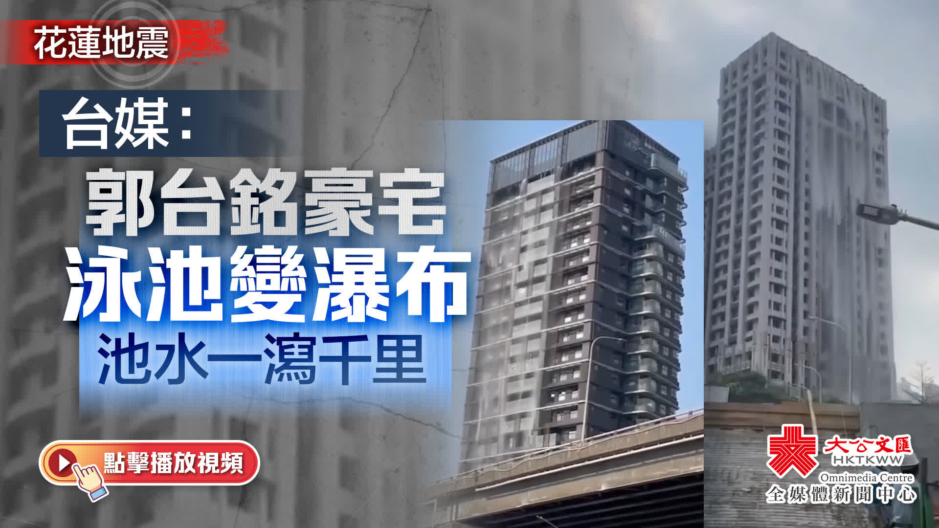 大公文匯全媒體報道,台灣花蓮縣海域今早(4月3日)7時58分發生7.3級地震,其後發生多次餘震。據台媒報道,鴻海科技集團創辦人郭台銘的豪宅頂樓泳池大量池水湧出,大廈瞬時變成瀑布。