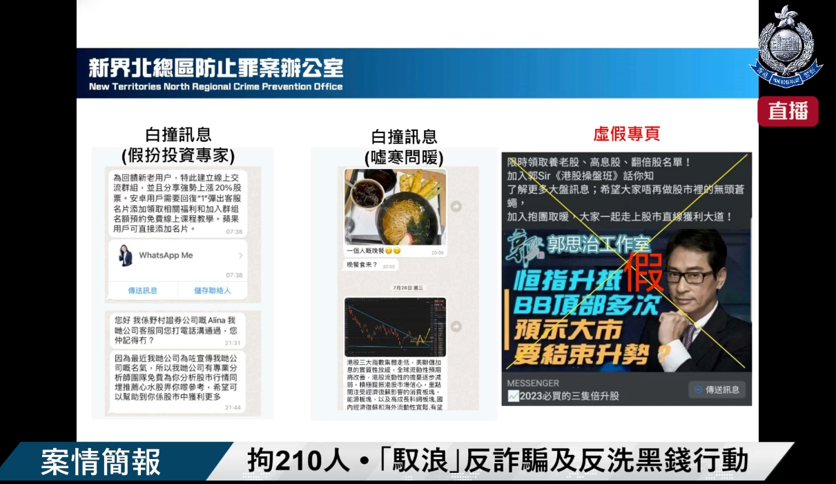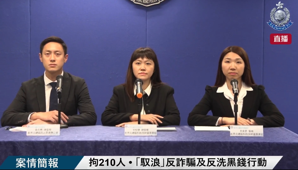 新界北總區科技及財富罪案組總督察宋程慧表示,今次行動共拘捕210名涉嫌干犯詐騙及洗黑錢等罪行人士,包括138男72女,年齡介乎15至80歲,涉及152宗本地案件,總損失達3.3億元。被捕人處理的犯罪得益高達4000萬港元,警方已防止轉移的犯罪得益為317萬元。