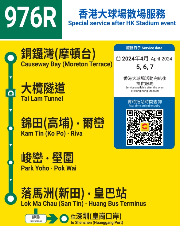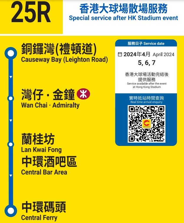 在賽事期間,城巴將按實際情況及需求加強多條途經大球場或銅鑼灣的主要路線服務。賽事結束後,25R及976R號線將提供由香港大球場一帶前往中環及新田(皇巴站)的散場特別服務。