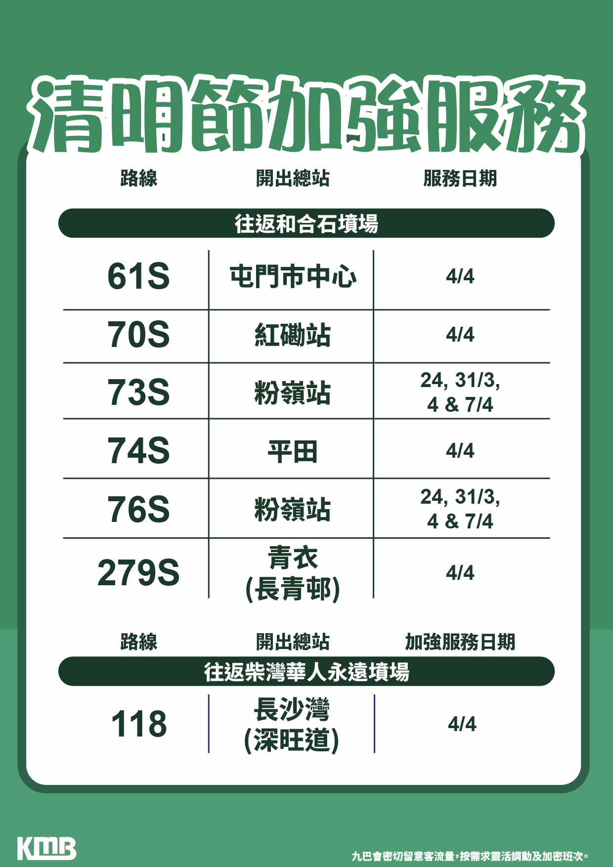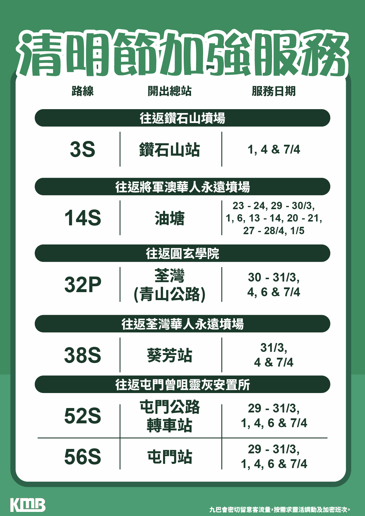為方便市民在清明節期間前往鑽石山墳場、將軍澳華人永遠墳場、圓玄學院、荃灣華人永遠墳場、曾咀靈灰安置所及和合石墳場等地方掃墓,九巴清明節期間有13條路線作特別安排及加強服務,詳見下圖↓↓
