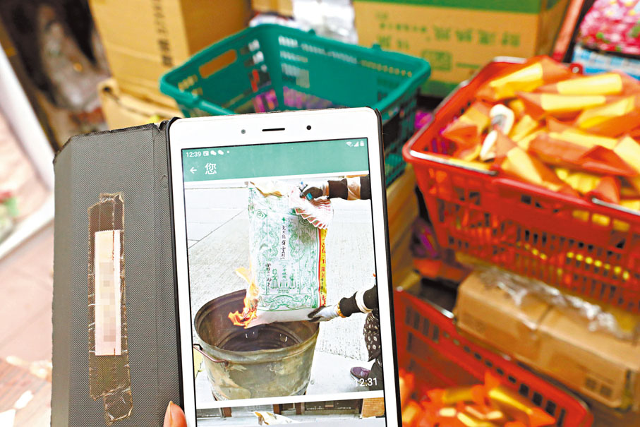 去年清明節期間,該店代燒衣包的查詢每日平均四五宗,今年也有不少查詢,高峰期每月都有大約100宗左右。他介紹,職員一般在紙紮舖門口代燒,有特別要求可到寺廟裏化寶,燒後職員會立即發送代燒衣包照片及影片給顧客作為紀錄。