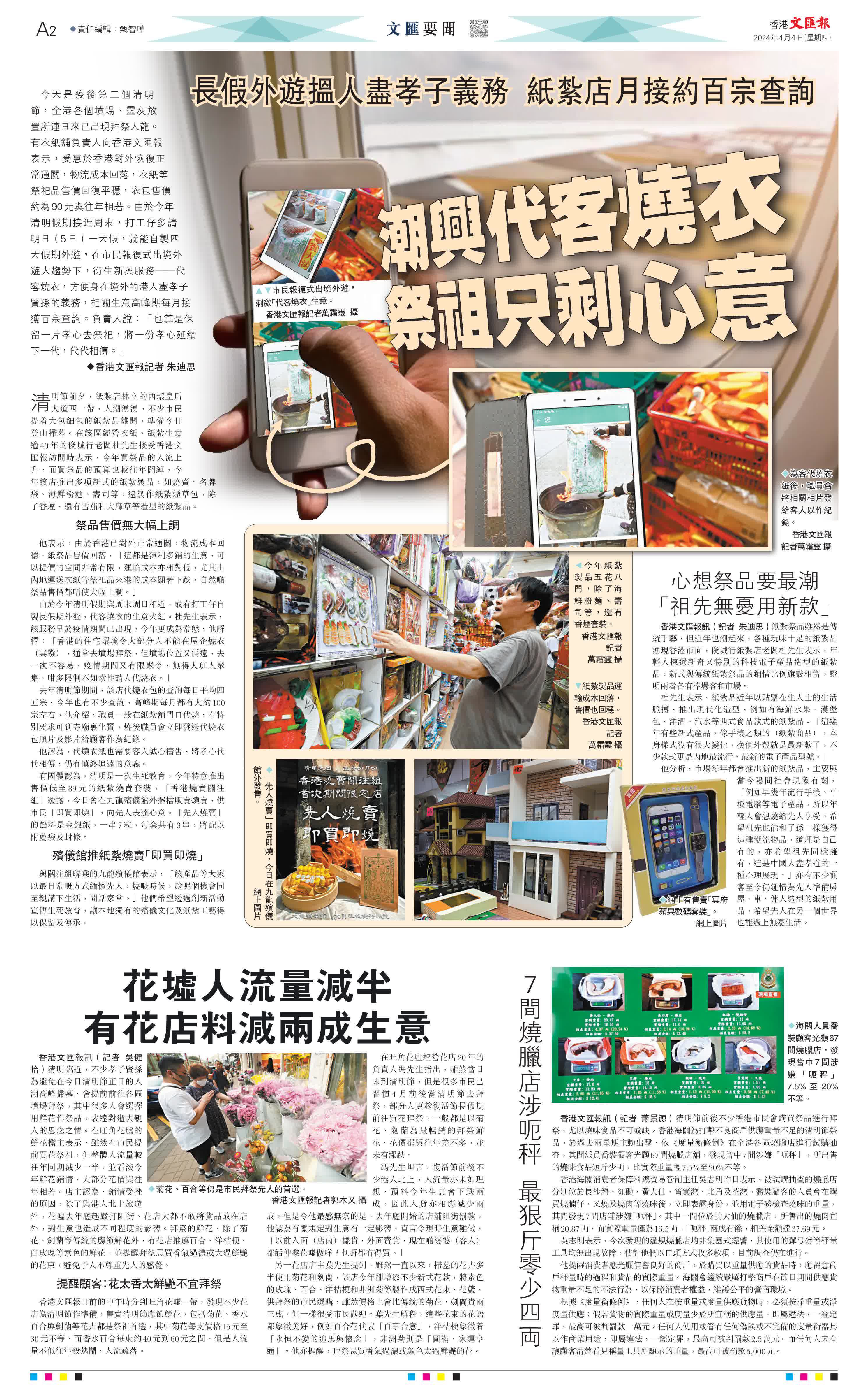 他表示,由於香港已對外正常通關,物流成本回穩,紙祭品售價回落,「這都是薄利多銷的生意,可以提價的空間非常有限,運輸成本亦相對低,尤其由內地運送衣紙等祭祀品來港的成本顯著下跌,自然啲祭品售價都唔使大幅上調。」