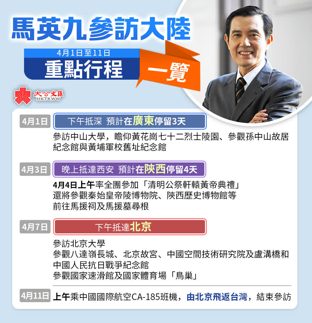 4月1日至11日,馬英九率台灣青年到廣東、陝西、北京等地尋根、交流。此前,馬英九一行在深圳、中山、珠海、廣州等地參訪。